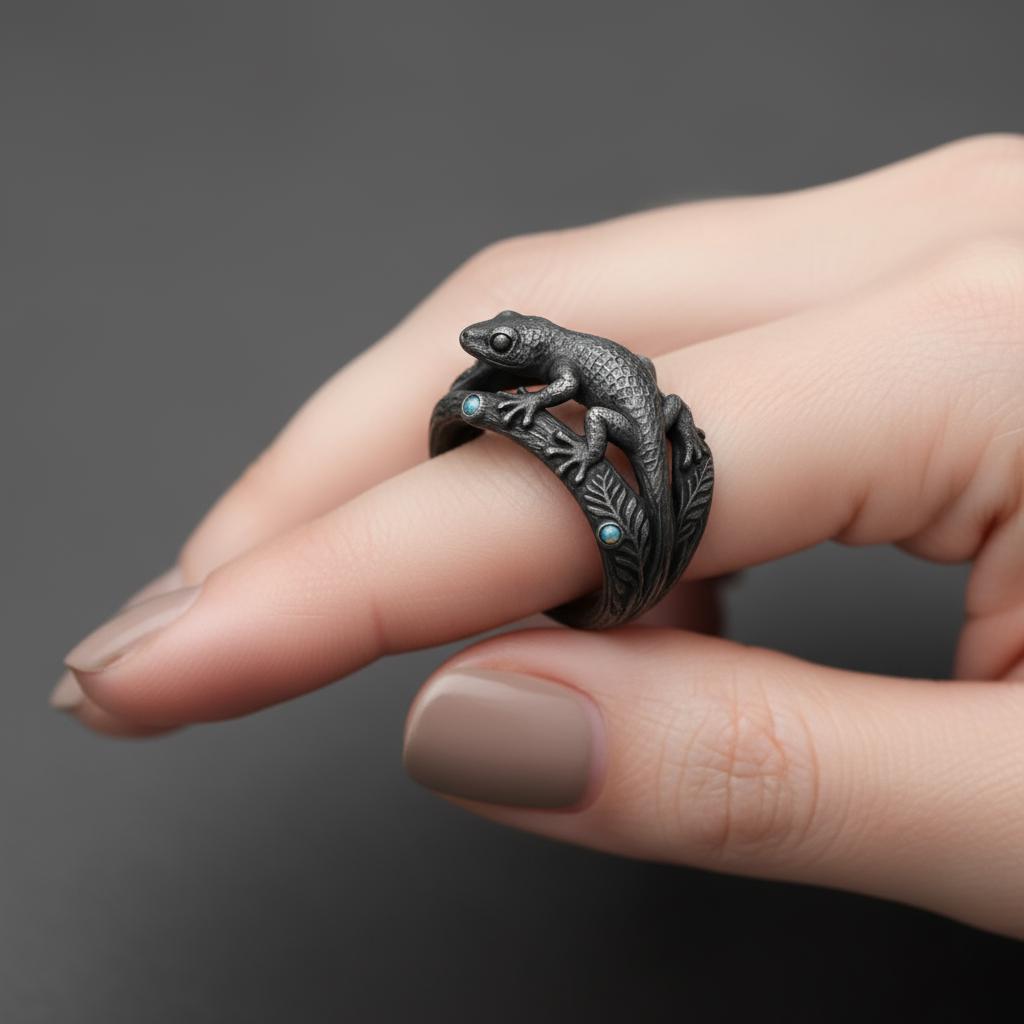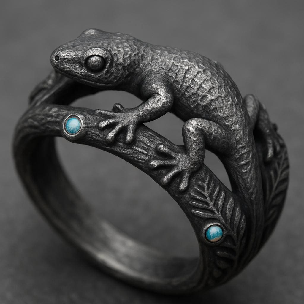 💫 Gecko Guardian Ring Handcrafted from S925 sterling silver, this Gecko Guardian Ring features a lifelike gecko resting gracefully on intertwined branches🦎🍃. Its textured scales, poised posture, and smooth curves give the piece a vivid, natural charm. The inlaid blue gemstones add a subtle glow, bringing a mystical touch to the design. This piece symbolizes agility, protection, and renewal, perfect for nature lovers, animal jewelry collectors, and those who enjoy unique, mysterious styles✨.