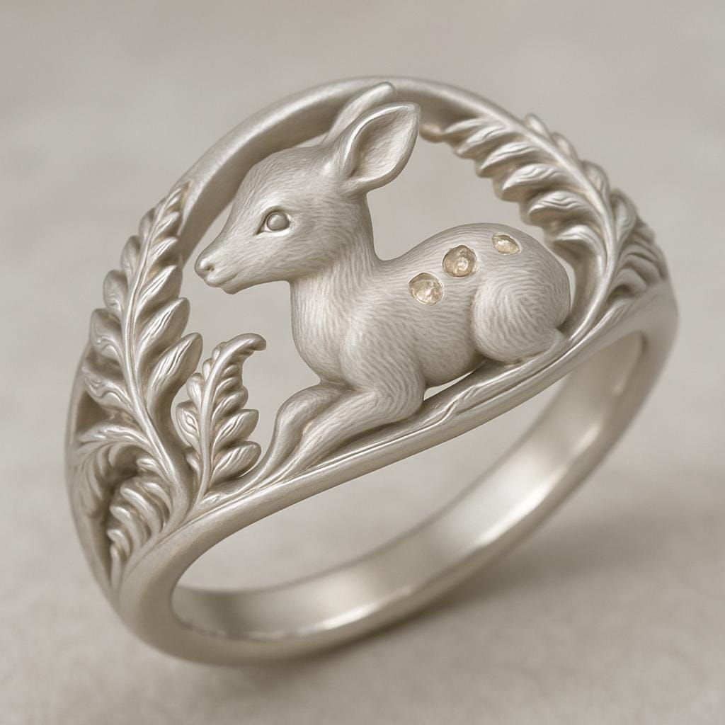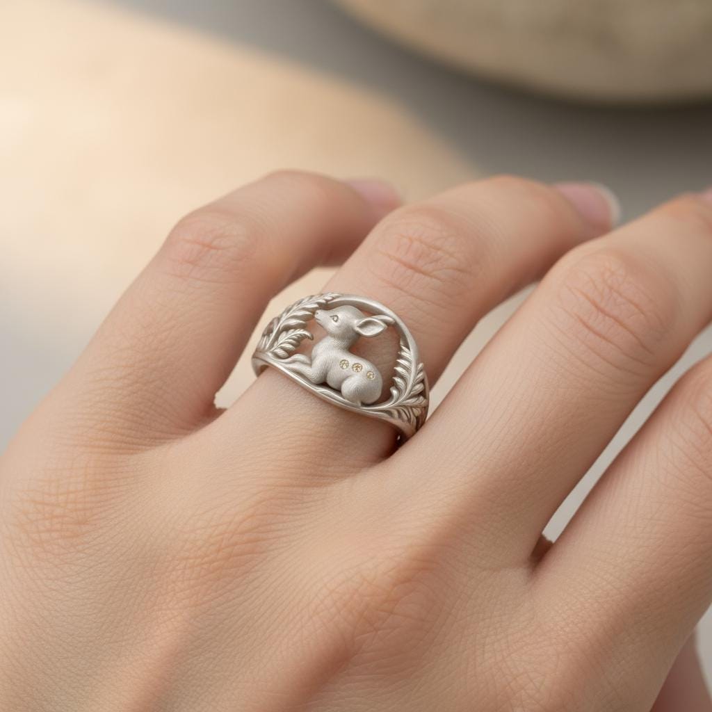 💫 Fawn Forest Ring Handcrafted from S925 sterling silver, this Fawn Forest Ring🦌. A gentle fawn lies gracefully at the center, framed by delicately carved forest leaves that curl around the band in an elegant arc. The soft contours and serene expression bring a peaceful woodland moment to life. Subtle polished accents highlight the fawn’s spotted back, adding a touch of quiet sparkle. This design symbolizes innocence, protection, and natural harmony, perfect for forest lovers, gentle souls, and those who adore soft, fairy-tale aesthetics🌿.
