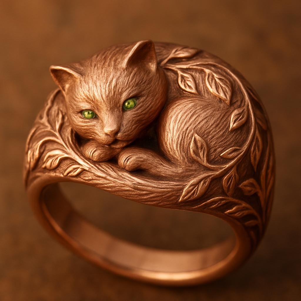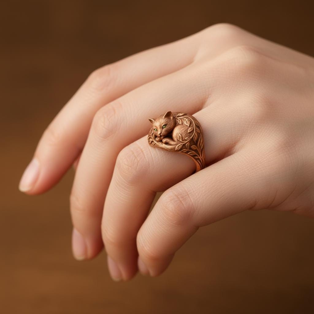 💫 Green-eyed Cat Ring Crafted from S925 sterling silver, this exquisite Green-eyed Cat Ring 🐱 Featuring a gracefully curled cat resting amid flowing leaf motifs, set with a vivid green zircon that brings the eyes to life. Delicate sculpting and a soft warm hue give the piece an elegant, gentle atmosphere. This piece symbolizes guardianship, elegance, and quiet companionship — perfect for cat lovers, nature enthusiasts, and anyone who enjoys poetic, animal-inspired jewelry🌿