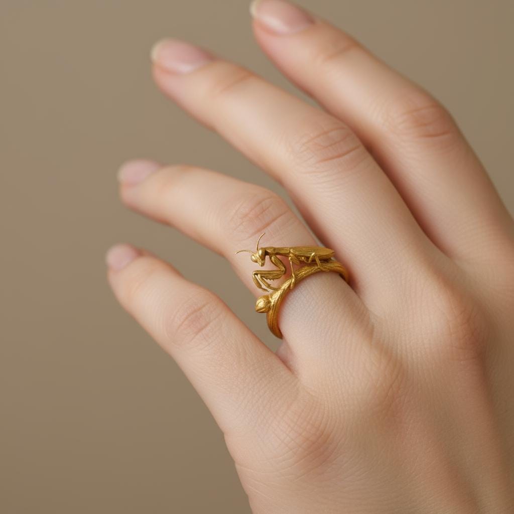 💫 Golden Mantis Ring Handcrafted from gold-plated S925 sterling silver, this Golden Mantis Ring🦗. A delicately sculpted praying mantis rests gracefully on a textured branch, its slender limbs and wings captured with lifelike precision. The warm golden finish enhances every contour, giving the piece a refined and artistic presence. This design symbolizes focus, intuition, and inner strength, perfect for those who appreciate calm determination and unique nature-inspired jewelry🪷.