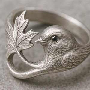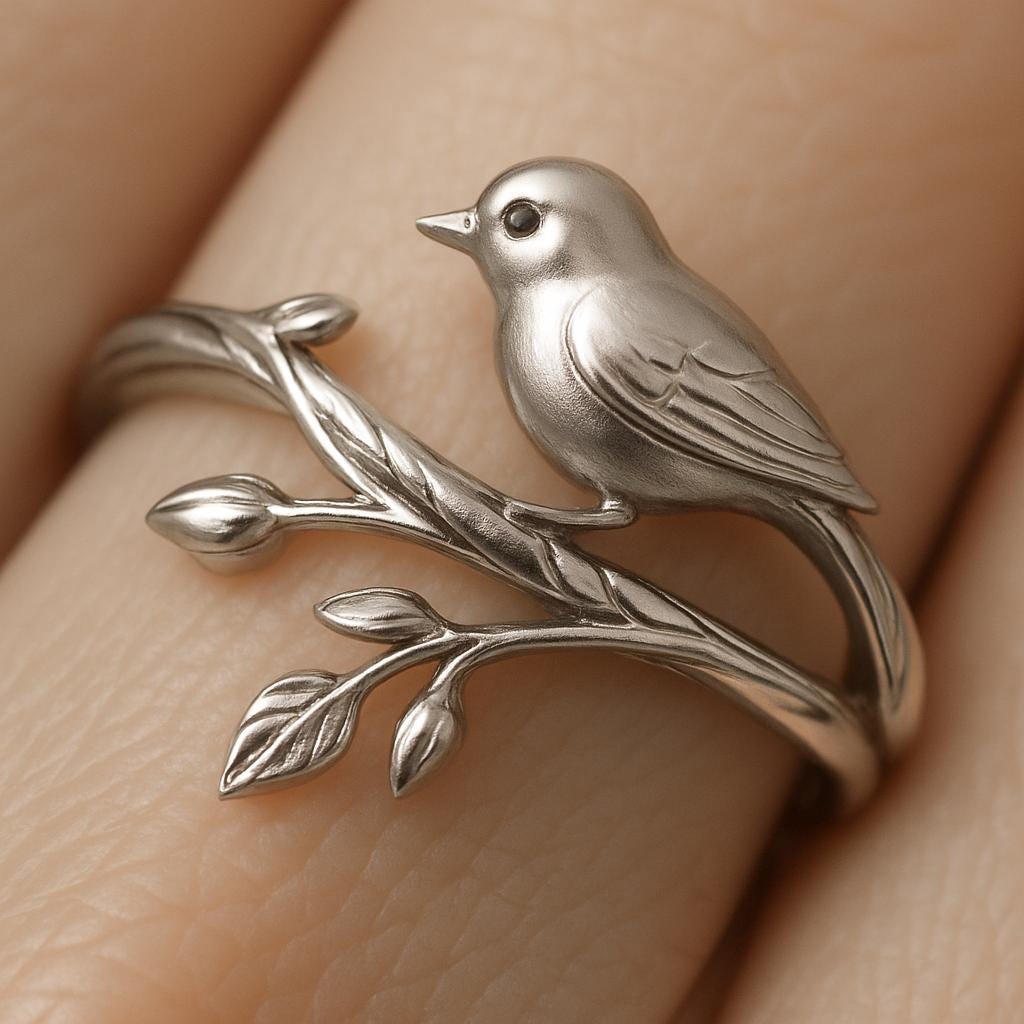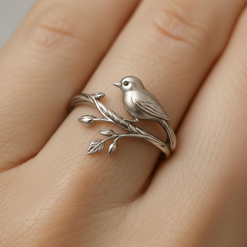 💫 Little Bird on Branch Silver Ring Carefully handcrafted from S925 sterling silver, this Little Bird Ring 🕊️✨ features a delicate bird perched gracefully on a slender branch with budding leaves. The fine carving captures the serenity of nature and the quiet elegance of a resting bird, symbolizing freedom, peace, and hope. Its open design offers a comfortable fit and timeless charm, making it perfect for daily wear or as a meaningful gift for nature lovers💖.