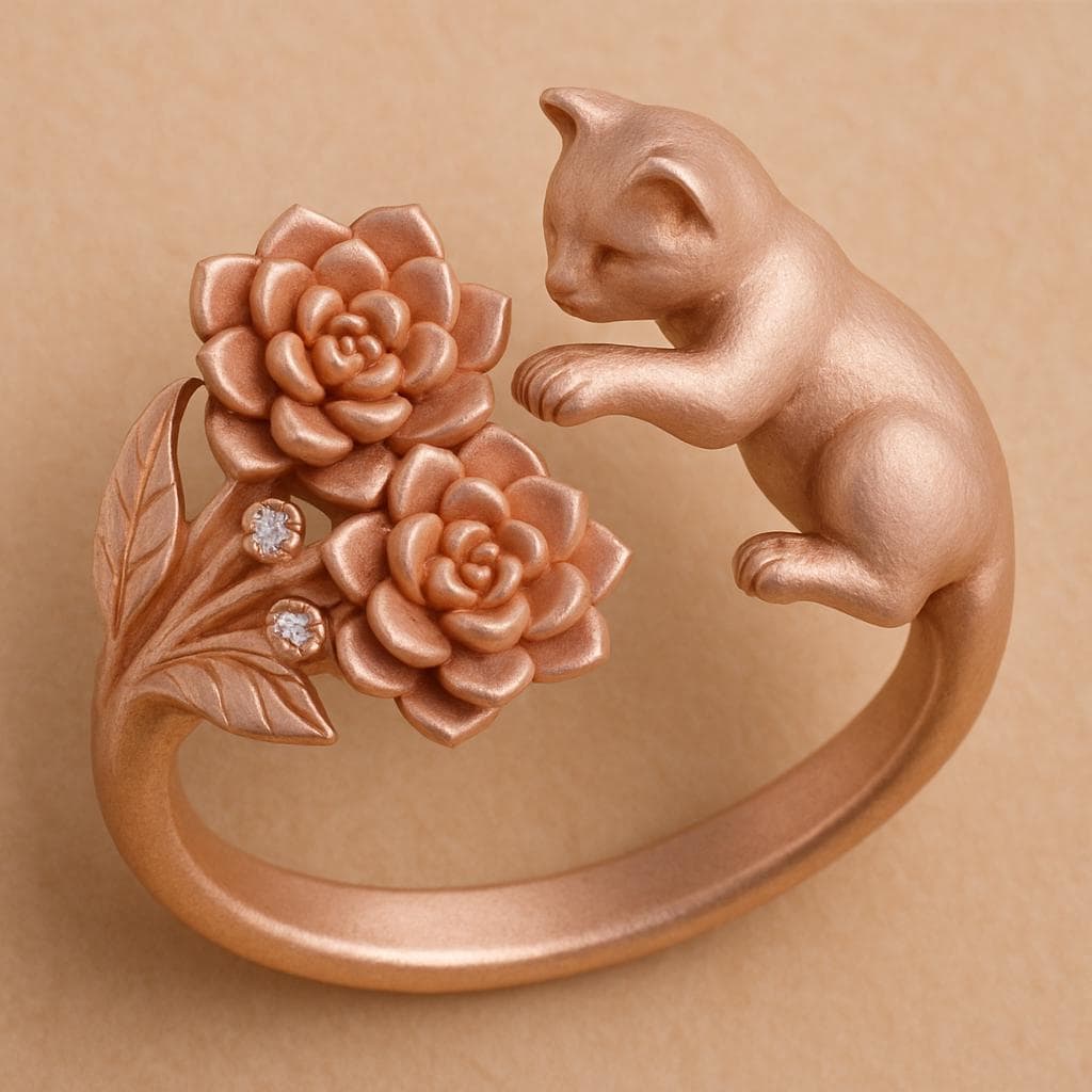 💫 Rose Gold Cat & Flower Ring Carefully handcrafted from rose gold-plated S925 sterling silver, this charming Cat & Flower Ring 🐱🌸 captures a playful kitten reaching toward blooming roses adorned with sparkling cubic zirconia. The detailed floral design and the kitten’s soft curves create a sense of innocence and gentle warmth. The rose gold tone adds elegance and romantic charm. Perfect for daily wear or as a heartwarming gift for cat lovers and dreamers alike🎁. A delicate piece that brings together nature, tenderness, and joy💖.