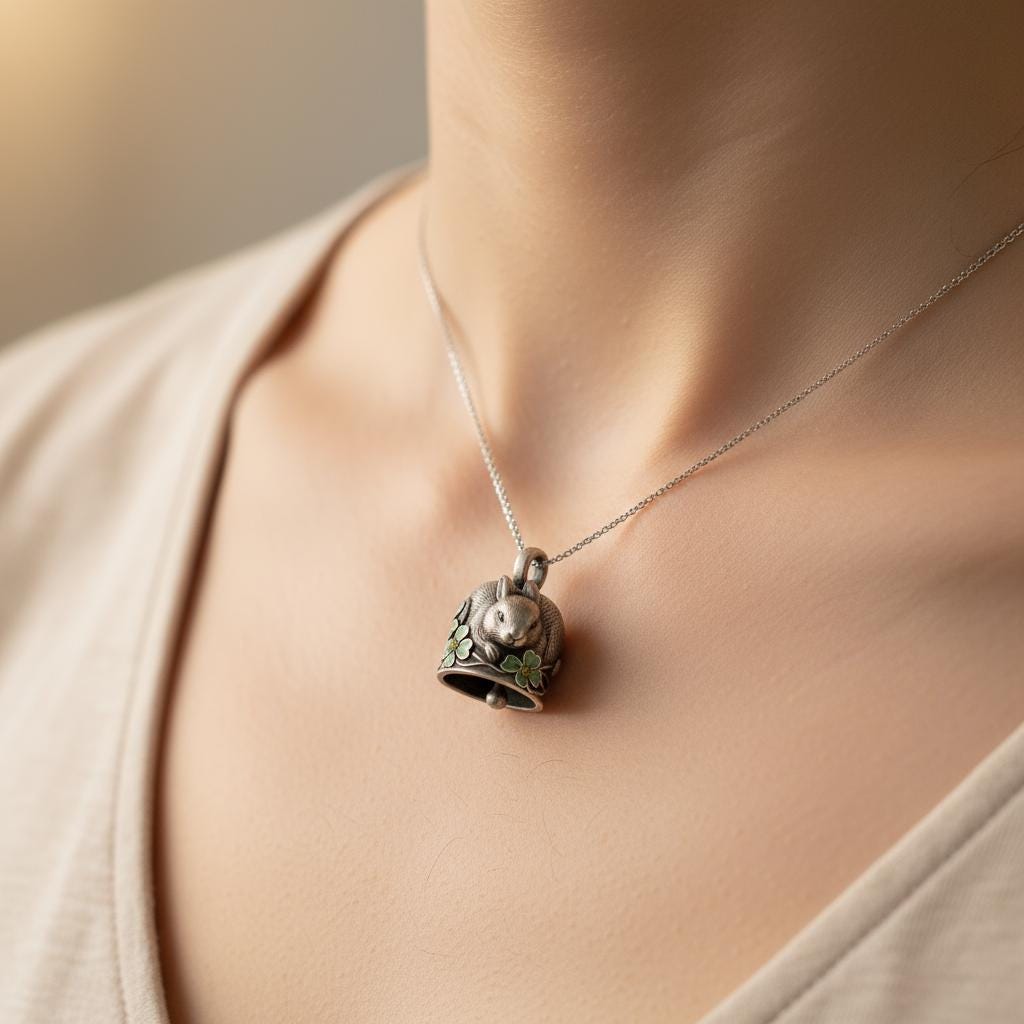💫 Clover Bunny Bell Pendant Handcrafted from S925 sterling silver, this Clover Bunny Bell Pendant🐰🍀. The pendant features an adorably sculpted bunny nestled around a bell, surrounded by soft green enamel clovers adorned with sparkling zircon centers. The combination of silver tones, gentle green, and golden-yellow accents brings out a natural freshness and whimsical charm. This design symbolizes luck, gentleness, and joyful blessings, perfect for those who love cute, nature-inspired jewelry full of good fortune✨.