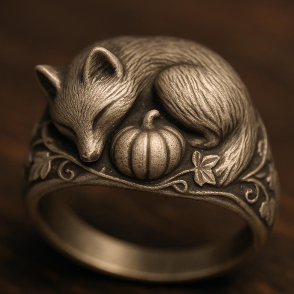 💫 Sleeping Fox & Pumpkin Ring Handcrafted from S925 sterling silver, this Sleeping Fox & Pumpkin Ring🦊🎃. The ring features a gently curled fox resting beside a small pumpkin, surrounded by graceful vine details that flow naturally along the band. The detailed carving brings the fox’s soft fur and the pumpkin’s smooth texture to life, creating a warm, autumnal feel. This design symbolizes peace, comfort, and harvest blessings, perfect for those who love cozy forest stories and gentle elegance🍂.
