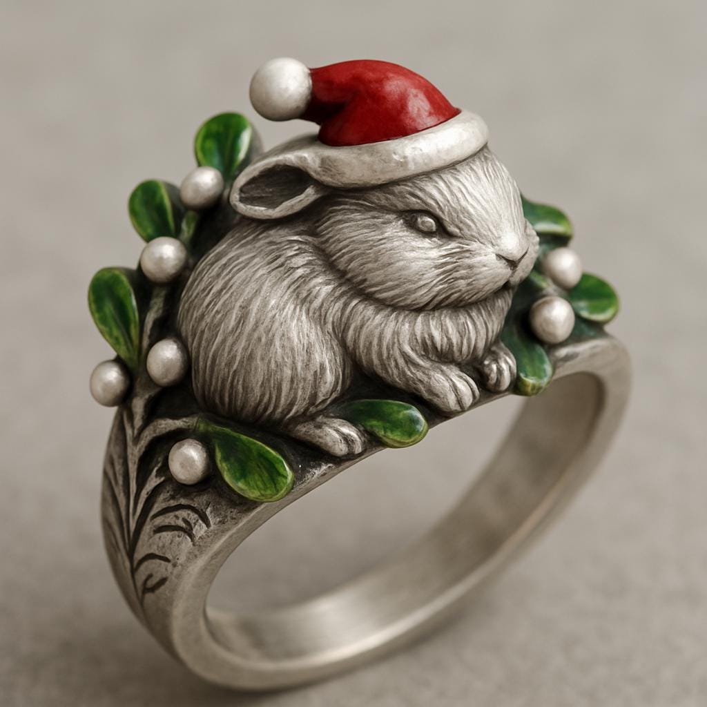 💫 Christmas Bunny Ring 🐰🎄 Crafted from S925 sterling silver, this exquisite Christmas Bunny Ring features a cute winter rabbit nestled among glossy green enamel leaves and white enamel berries, topped with a festive red Santa hat 🎅. The detailed fur texture and smooth enamel bring a warm holiday charm. This piece symbolizes warmth, innocence, and festive joy — perfect for animal lovers, holiday gift giving, and anyone who enjoys whimsical jewelry ✨