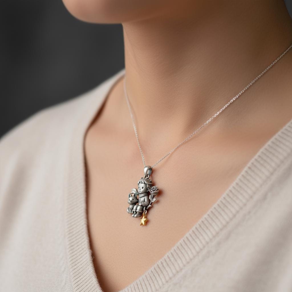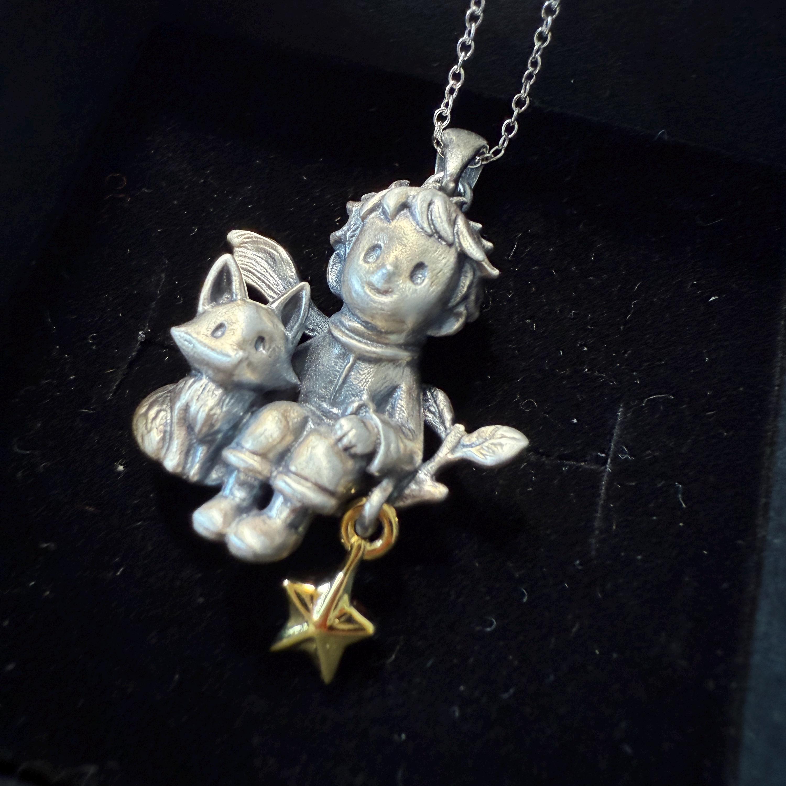 💫 Little Prince & Fox Pendant Handcrafted from S925 sterling silver, this poetic Little Prince & Fox Pendant 🌟 features the beloved Little Prince sitting beside his loyal fox, holding a delicate rose in one hand, with a golden star dangling gently below. The fine craftsmanship captures the warmth of companionship and the innocence of childhood wonder. This pendant symbolizes friendship, love, and the courage to dream — perfect for those who believe in kindness and magic that never fades🌹