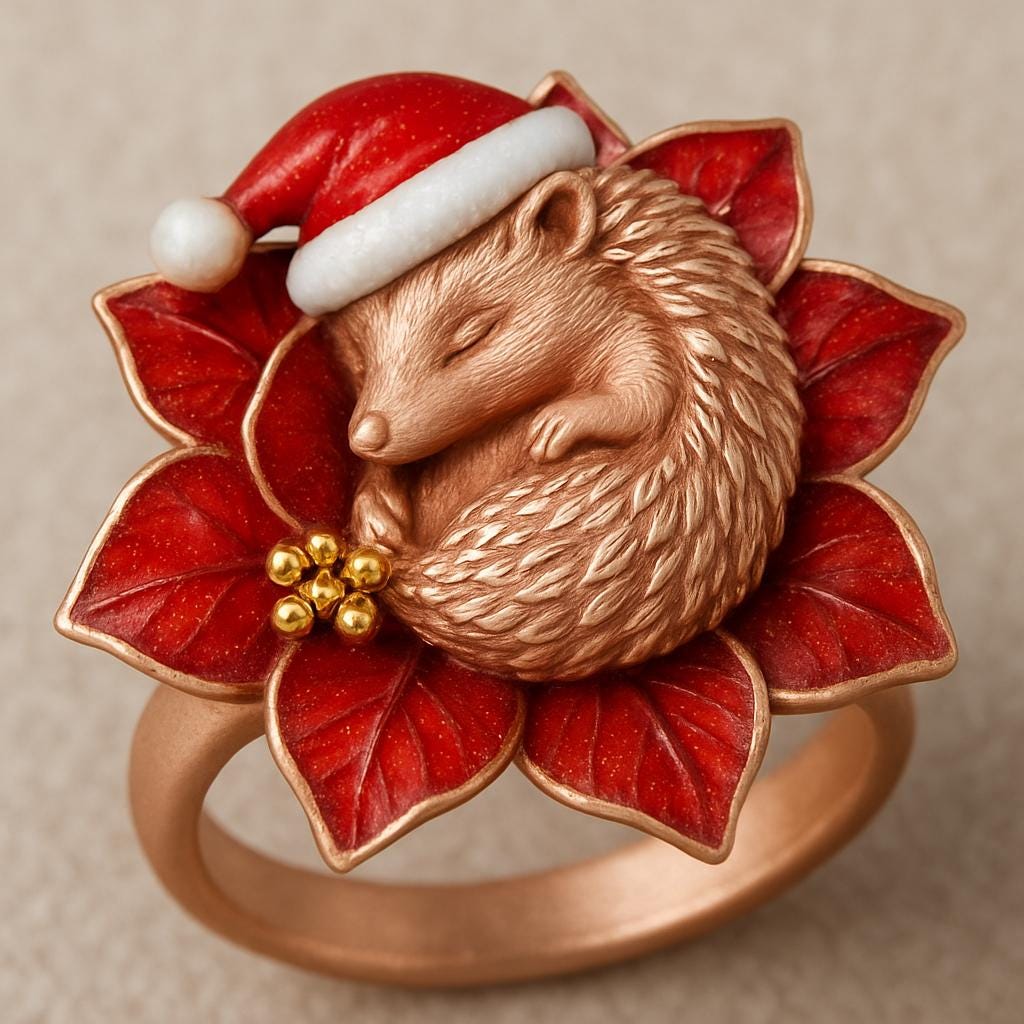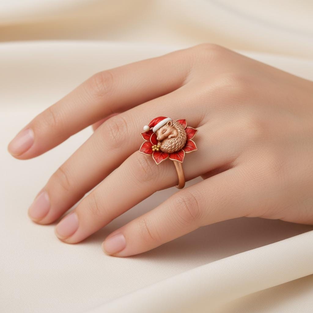💫 Christmas Hedgehog Bloom Ring Crafted from S925 sterling silver, this exquisite Christmas Hedgehog Bloom Ring 🎄 Featuring a curled hedgehog resting at the heart of a poinsettia-shaped bloom, accented with rich red enamel and delicate gold-toned berries. The surface is artistically textured for a warm, handcrafted feel. The festive palette and gentle pose create a cozy winter atmosphere✨ This piece symbolizes warmth, protection, and holiday joy — perfect for winter lovers, animal lovers, and those who enjoy whimsical jewelry❄️