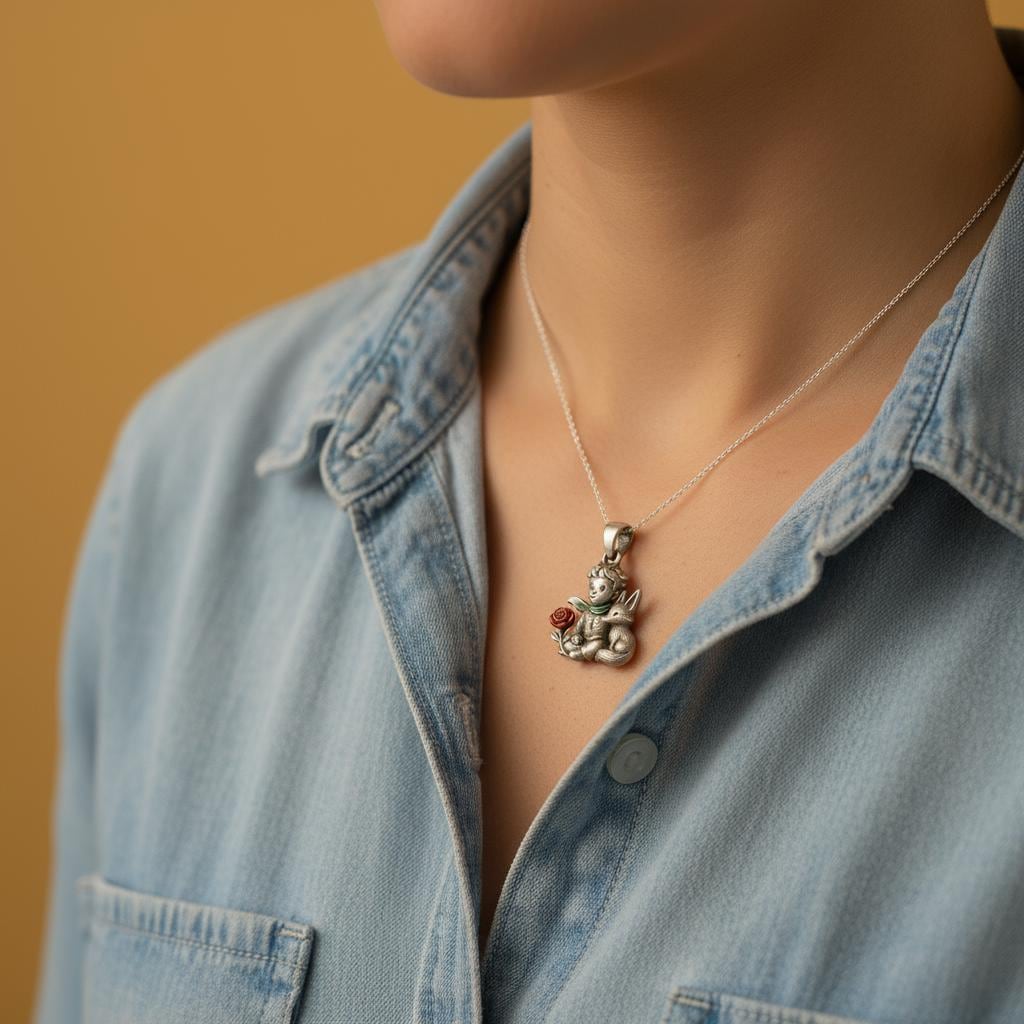 💫 Enamel Little Prince & Fox Pendant Handcrafted from S925 sterling silver, this enchanting Enamel Little Prince & Fox Pendant 🌹 depicts the Little Prince sitting peacefully beside his fox companion, with a red enamel rose blooming softly at his side and a green enamel scarf flowing gently around his neck. The meticulous enamel detailing brings warmth and vivid color to the timeless silver, capturing the tenderness and depth of their quiet bond. This piece symbolizes innocence, loyalty, and gentle love, making it a perfect keepsake for dreamers and romantics who value heartfelt connections💫