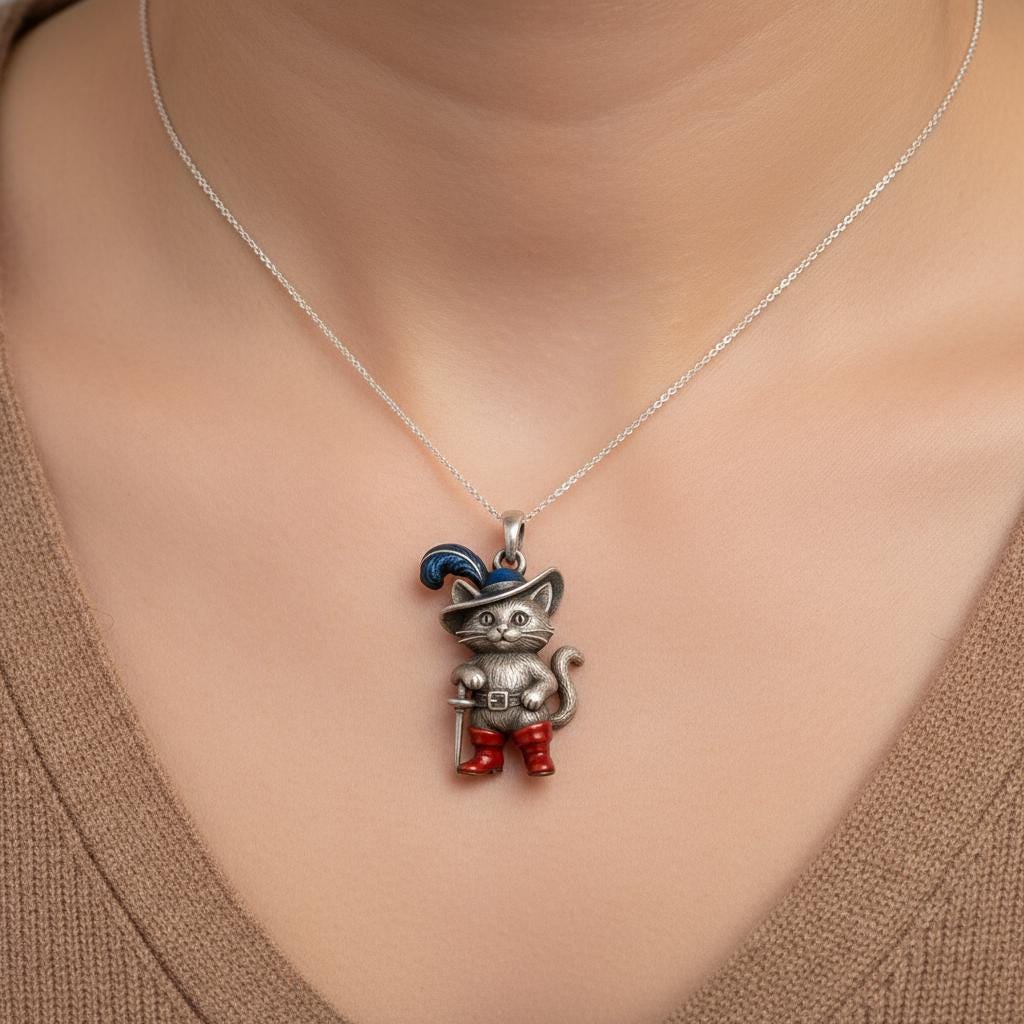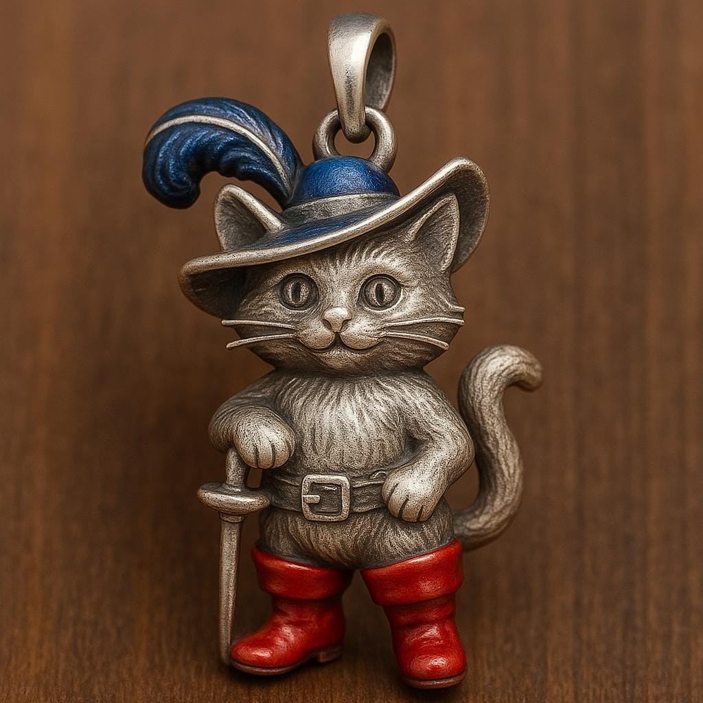 💫 Enamel Puss in Boots Pendant Handcrafted from S925 sterling silver, this charming Enamel Puss in Boots Pendant 🐱 features an adventurous cat standing proudly with his sword, wearing glossy red enamel boots and a blue-feathered hat that captures his bold, dashing spirit. The delicate enamel coloring adds warmth and vitality to the silver form, while the detailed carving gives the cat a lifelike, mischievous charm. This piece symbolizes courage, wit, and playful confidence — perfect for those who walk through life with curiosity and style✨