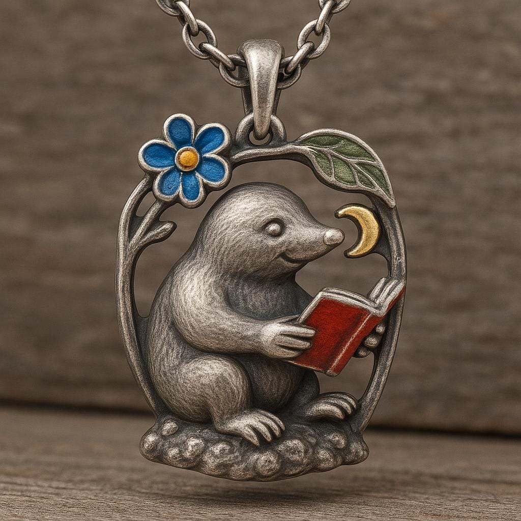 💫 Reading Mole Pendant Crafted from S925 sterling silver, this exquisite Reading Mole Pendant 📚🌙 Featuring a cozy little mole sitting atop textured soil, reading a tiny red book beneath a crescent moon, framed by delicate enamel-painted leaves and a vivid blue flower. The warm enamel colors and sculpted details create a gentle, storybook-like charm, perfect for nature lovers and whimsical souls. This piece symbolizes curiosity, wisdom, and the quiet joy of learning — perfect for book lovers, forest-themed jewelry fans, and anyone who cherishes peaceful moments✨