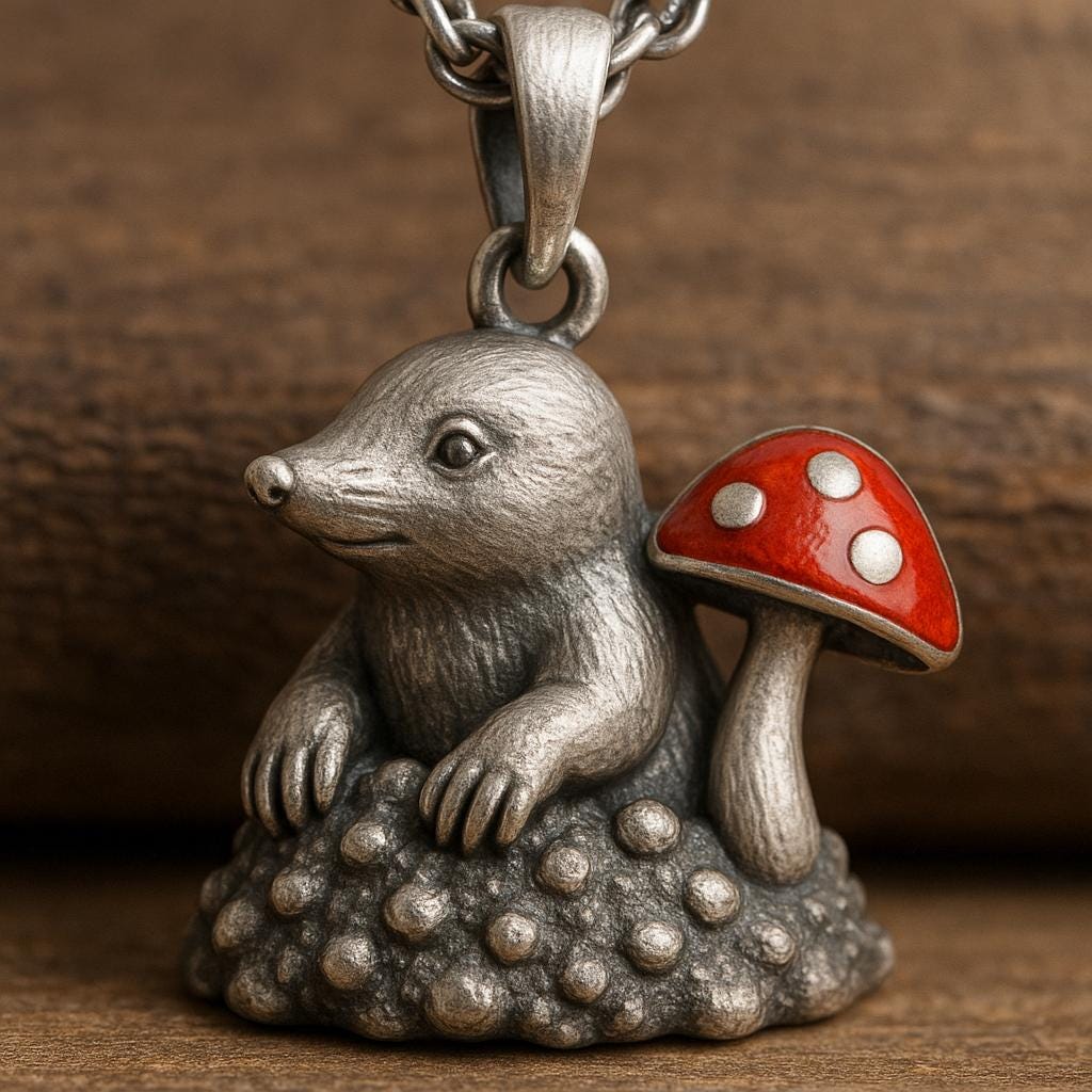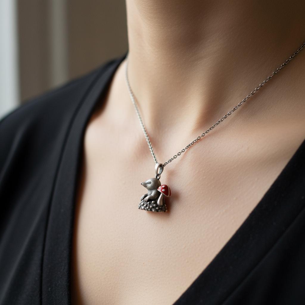 💫 Mole & Mushroom Pendant Crafted from S925 sterling silver, this exquisite Mole & Mushroom Pendant🐾🍄 features a charming little mole emerging from a textured mound, paired with a vivid red enamel mushroom, creating a whimsical woodland scene. The detailed fur texture and lifelike pose bring a touch of storybook magic to the piece. This pendant symbolizes curiosity, exploration, and gentle warmth — perfect for nature lovers, forest-themed jewelry fans, and those who adore cute animal motifs✨