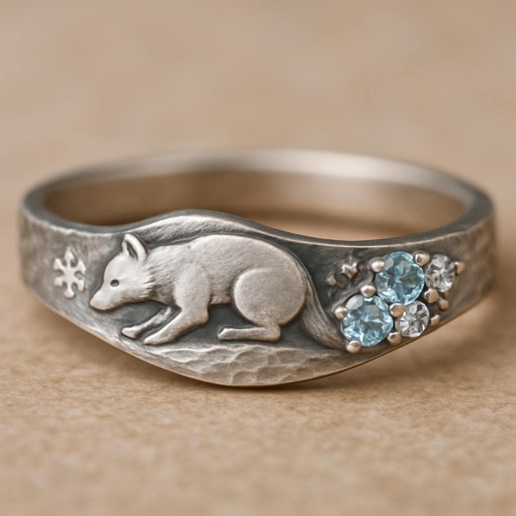 💫 Snow Fox Ring Handcrafted from S925 sterling silver, this delicate Snow Fox Ring 🦊 features a quietly resting arctic fox beside twin clusters of zircon stones — shimmering in both icy blue and pure white hues, evoking the serenity of winter snowfields. The softly hammered texture adds an organic feel, while the fine details of the fox bring out a sense of calm and gentle grace. This ring symbolizes loyalty, protection, and inner tranquility — perfect for those who carry warmth even in the coldest days❄️