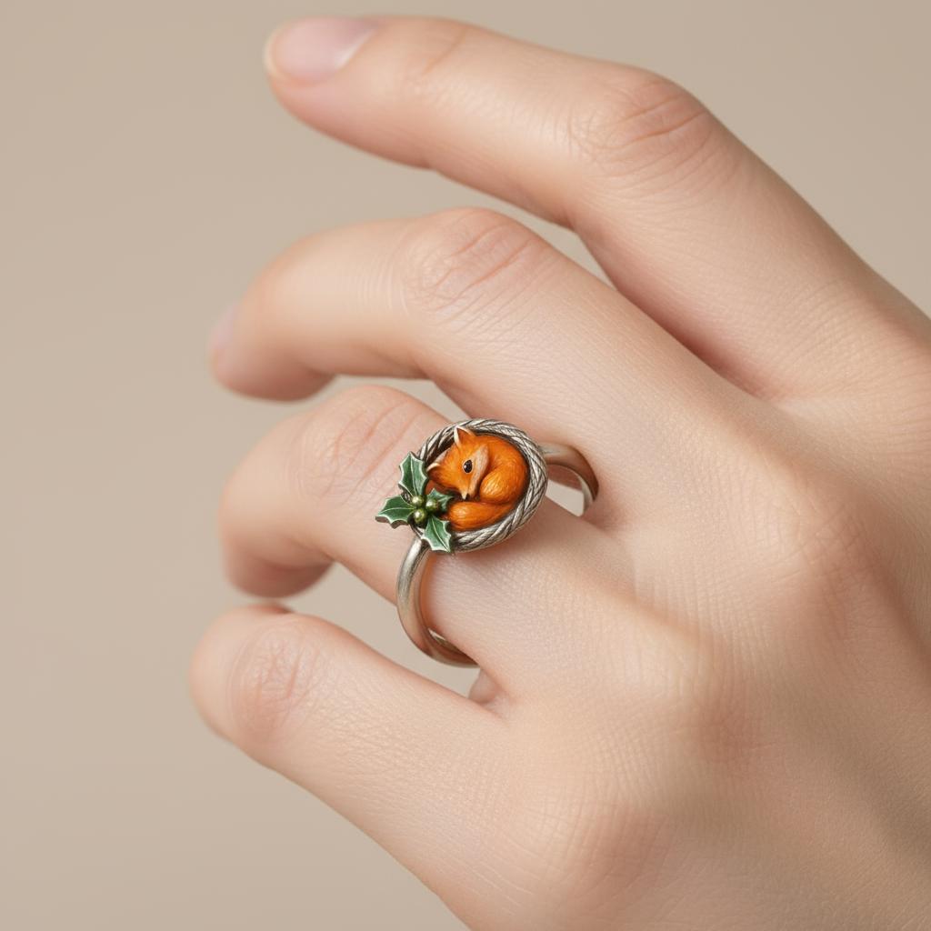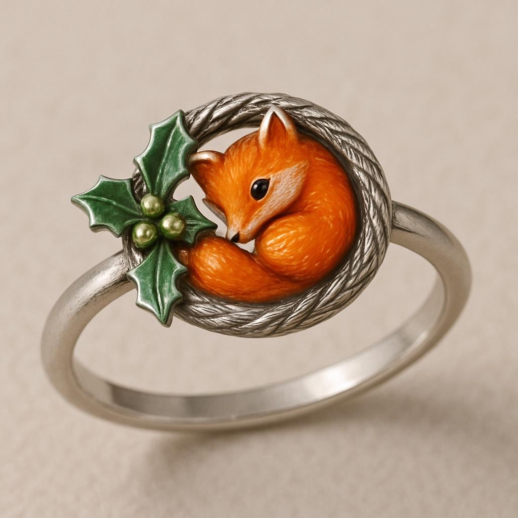 💫 Color Enamel Fox Ring Handcrafted from S925 sterling silver, this delightful Color Enamel Fox Ring 🦊 features a curled orange fox resting within a twisted silver wreath, accented with lush green holly leaves and golden berries — each detail brought to life through vivid, hand-painted enamel. The harmonious blend of warm orange and deep green tones exudes cozy woodland charm and artistic vitality. This ring symbolizes protection, warmth, and playful spirit — perfect for those who find beauty in nature’s colors and carry joy in their heart🍂