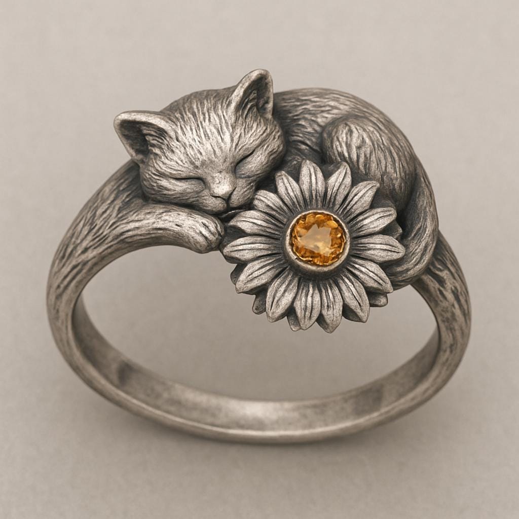 💫 Sleeping Cat & Sunflower Ring Crafted from S925 sterling silver, this charming Sleeping Cat & Sunflower Ring 🐱 features a peacefully sleeping cat curled around a blooming sunflower, whose center is adorned with a warm golden zircon that radiates gentle light. The detailed fur texture and soft curves evoke warmth and tranquility, like a lazy afternoon nap under the sun. This ring symbolizes comfort, love, and serenity — perfect for those who find beauty in small, peaceful moments☀️