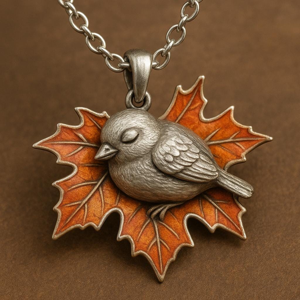 💫 Maple Bird Pendant 🍁🐦 Crafted from S925 sterling silver, this exquisite Maple Bird Pendant brings together a peacefully resting bird nestled atop a vivid enamel maple leaf. The soft contours of the bird contrast beautifully with the warm autumn tones of the leaf, creating a harmonious and poetic woodland moment frozen in time. This piece symbolizes tranquility, protection, and gentle warmth — perfect for those who cherish nature’s quiet beauty and warm-hearted elegance 🍂