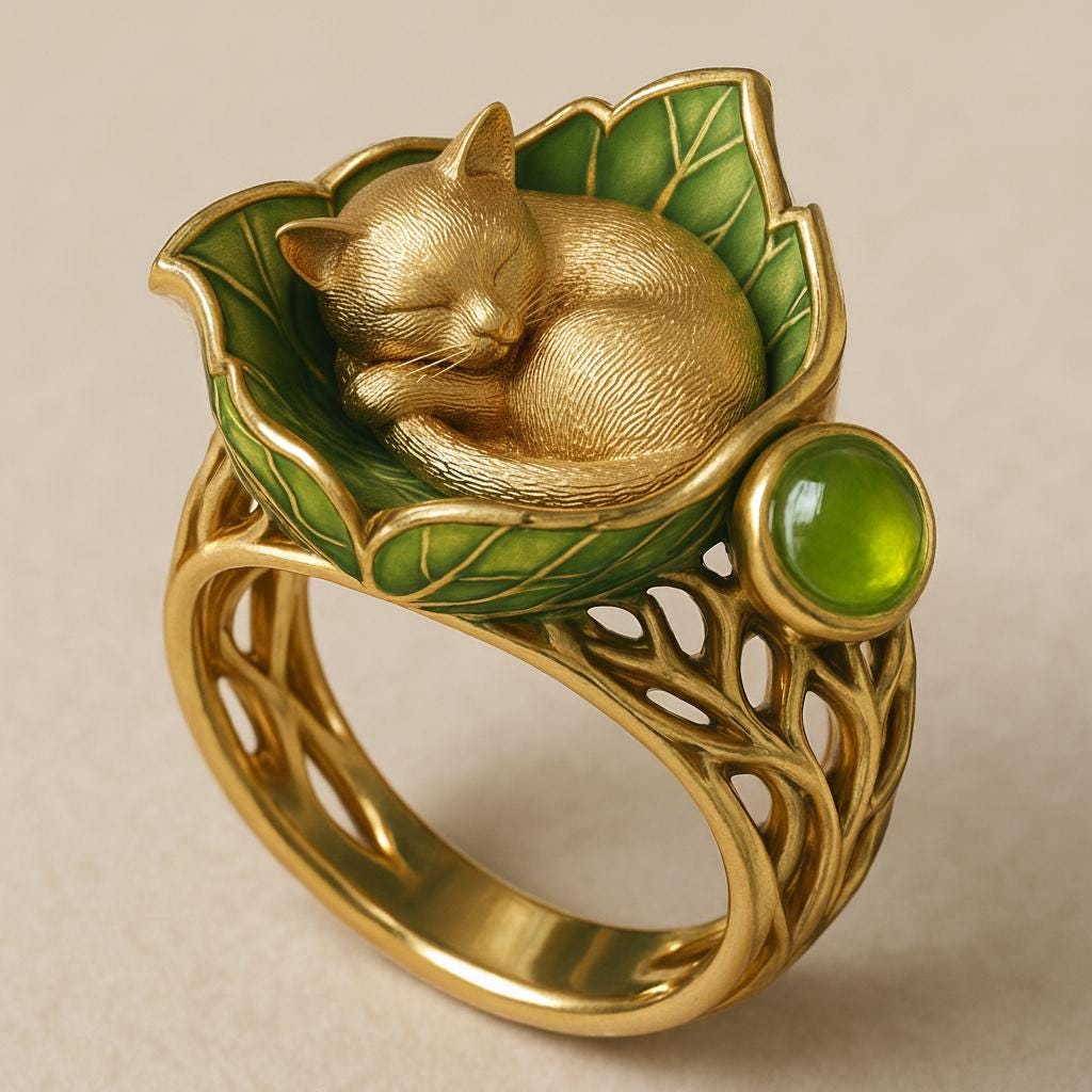 💫 Golden Cat in Leaf Ring Carefully handcrafted from gold-plated S925 sterling silver, this Cat in Leaf Ring 🐱✨ features a peacefully sleeping cat curled within a green enamel leaf, accompanied by a glistening gemstone on the side. The intricate enamel work captures the beauty of nature, while the golden sheen adds a touch of warmth and serenity. It symbolizes peace, comfort, and gentle companionship, making it perfect for daily wear or as a meaningful gift for animal lovers🎁. A unique piece blending artistry, nature, and tenderness💖.