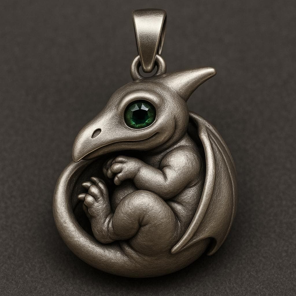 💫 Baby Dragon Guardian Pendant 🐉 Crafted from S925 sterling silver, this exquisite Baby Dragon Guardian Pendant captures a curled, newborn dragon resting peacefully in its shell-like pose. Its smooth sculpted wings, tiny claws, and expressive emerald-like zircon eye create a lifelike and enchanting presence. The matte silver finish adds a mystical, ancient-relic feel, as if this little creature came from a forgotten world. This piece symbolizes protection, hidden strength, and quiet companionship — perfect for fantasy lovers, dragon enthusiasts, or anyone drawn to magical creatures ✨