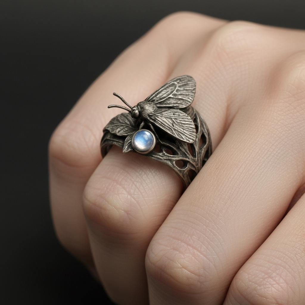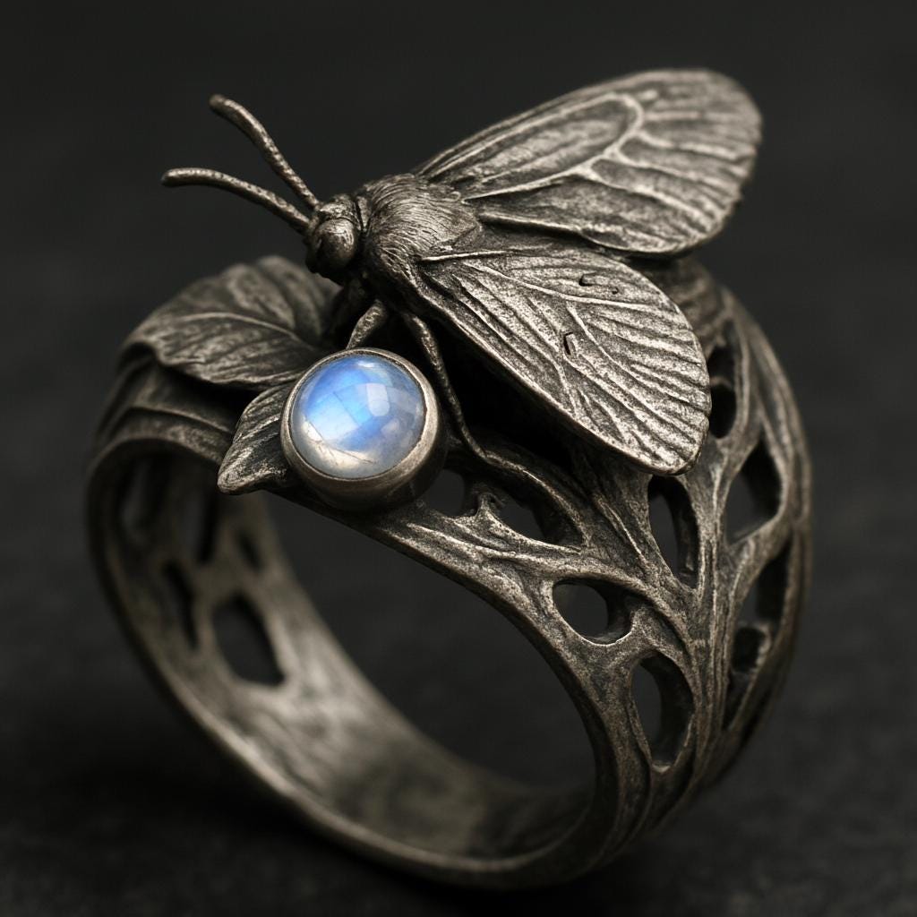 💫 Moonlight Moth Ring Crafted from S925 sterling silver, this mesmerizing Moonlight Moth Ring 🦋✨ captures the quiet elegance of nature in twilight. A delicately detailed moth perches gracefully upon openwork branches, its finely etched wings spreading with a lifelike sense of motion. At its side rests a glowing opal gemstone, shimmering softly with ethereal blue and milky hues — like a moonbeam caught in flight. This ring embodies transformation, intuition, and the beauty of fleeting moments, making it a poetic choice for those who find light within the night.