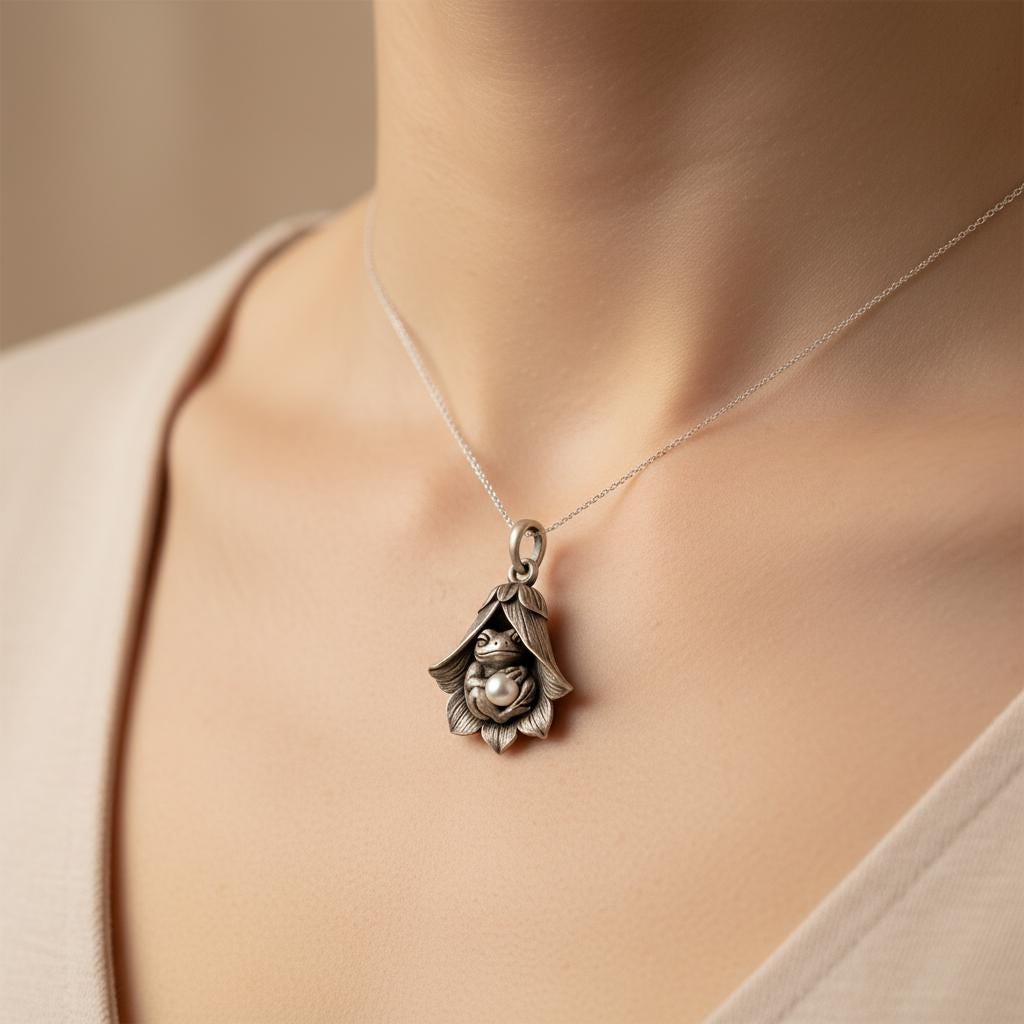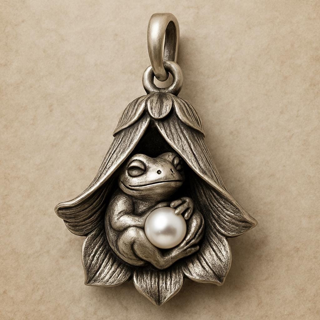 💫 Frog in Bloom Pendant Crafted from S925 sterling silver, this exquisite Frog in Bloom Pendant 🐸🌸 features a tiny frog curled inside a blooming petal, gently holding a luminous white pearl at its center. The contrast between the delicate floral form and the peaceful frog creates a calming, poetic aura — like a quiet moment found in nature’s embrace. This piece symbolizes serenity and natural harmony — perfect for nature lovers, forest spirit fans, or anyone seeking a peaceful, unique accessory✨