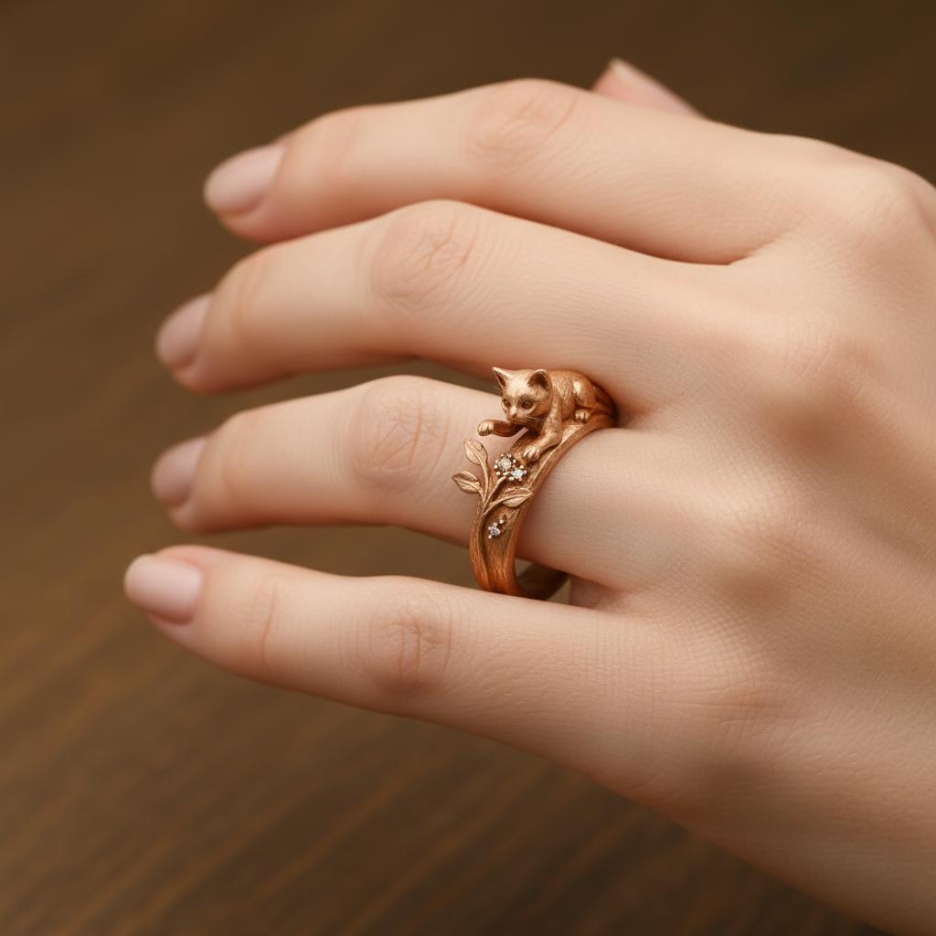 💫 Playful Cat Ring Crafted from rose gold-plated S925 sterling silver, this charming Playful Cat Ring 🐾✨ depicts an adorable kitten playfully reaching toward a delicate flower, its bright zircon gemstones sparkling like morning dew. The branch-shaped band flows naturally beneath the kitten, blending lifelike detail with artistic grace. This piece captures the warmth and curiosity of a kitten in spring—perfect for animal lovers and those who appreciate whimsical, elegant design🌸.