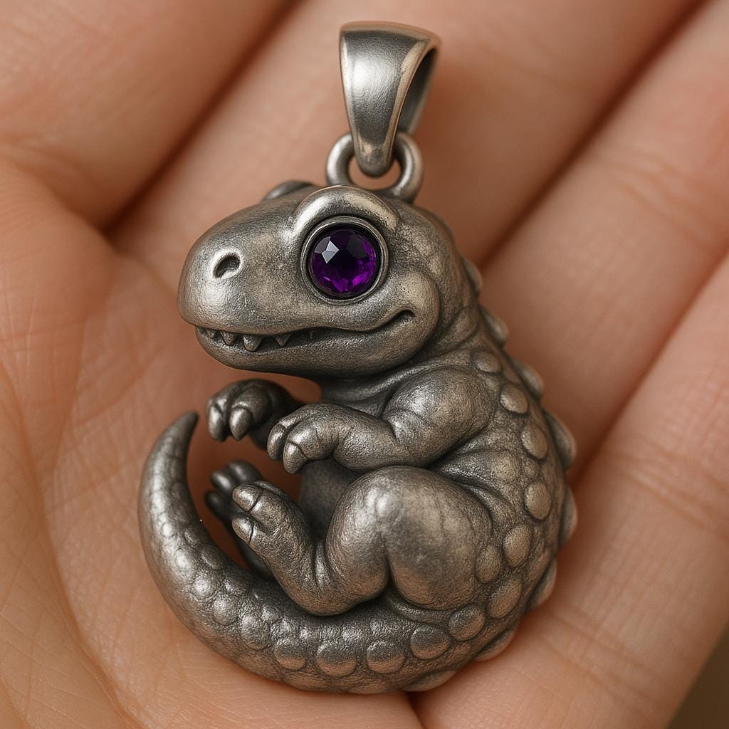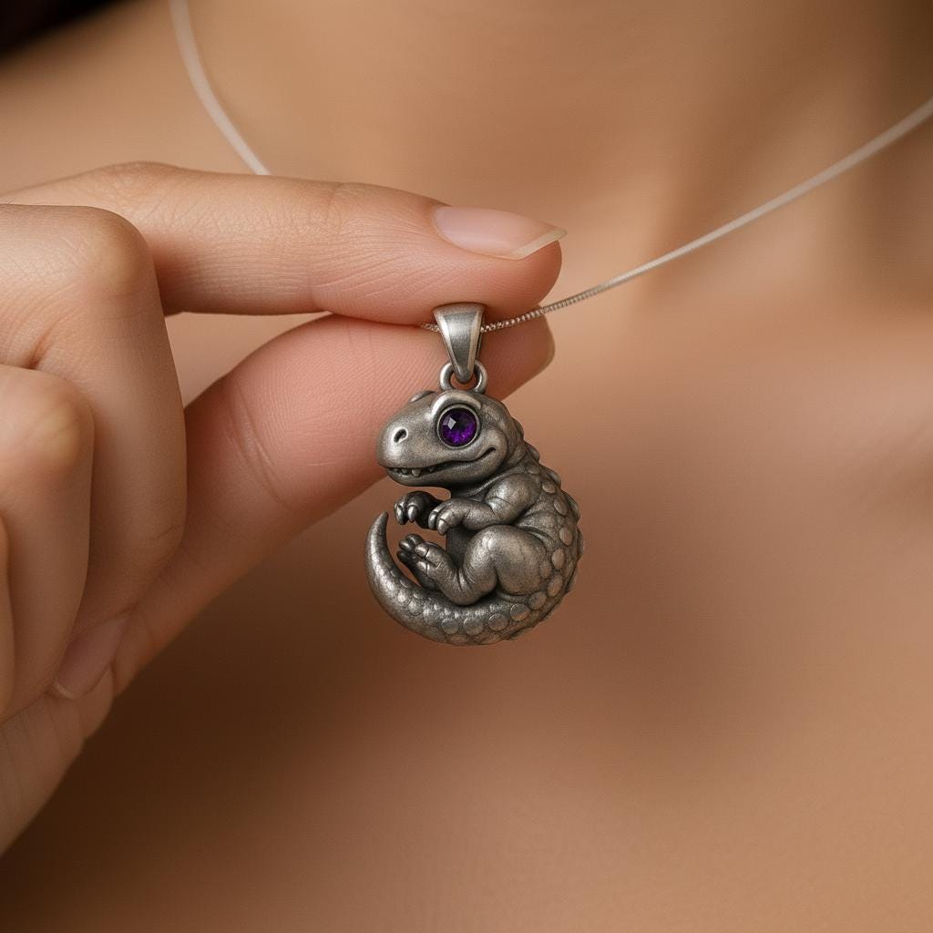 💫 Baby Dino Hug Pendant Crafted from S925 sterling silver, this adorable Baby Dino Hug Pendant 🦕 Featuring a curled baby dinosaur with a plump tail and a sparkling purple zircon eye, it sits as if asking for a hug. The subtle antique finishing adds depth to its tiny scales, giving it a charming, storybook-like personality. This piece symbolizes protection, curiosity, and playful companionship — perfect for dinosaur lovers, collectors of cute aesthetics, or anyone who cherishes childlike wonder✨