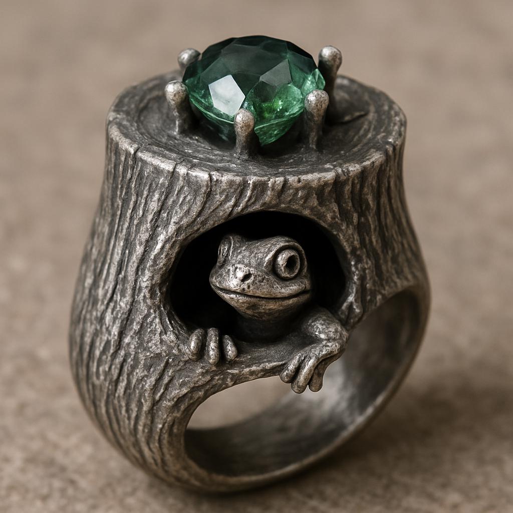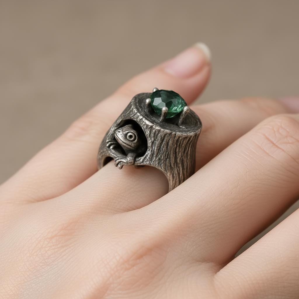 💫 Hidden Forest Frog Ring Crafted from S925 sterling silver, this exquisite Hidden Forest Frog Ring features a curious little frog peeking from a hollow tree stump, topped with a vivid green cubic zirconia gemstone like a mystical forest treasure🐸 The playful composition gives the design a whimsical fairytale charm, as if guarding a secret deep in the woods🌿 This piece symbolizes curiosity, protection, and the magic of exploration — perfect for nature lovers and imaginative souls 💚