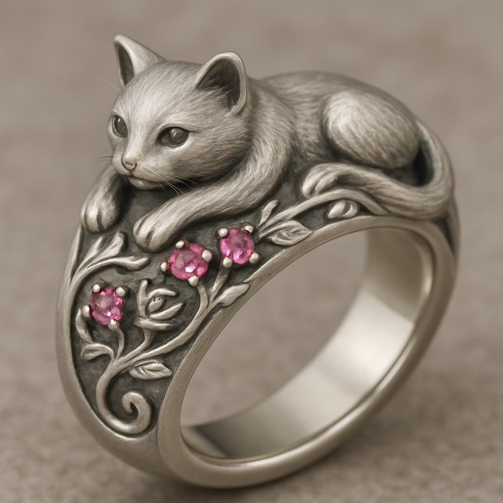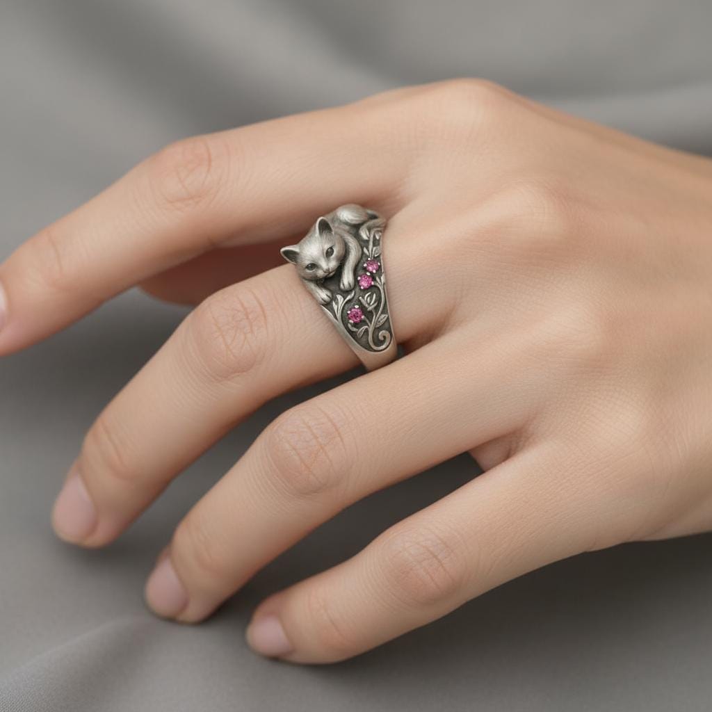 💫 Sleeping Kitten Garden Ring Crafted from S925 sterling silver, this exquisite Sleeping Kitten Garden Ring captures a relaxed little cat lying atop blossoming branches, adorned with sparkling pink zircon stones that resemble tiny blooming flowers. 🐱🌸 The detailed carving brings the kitten’s peaceful posture to life, creating a miniature tranquil garden on your hand. This piece symbolizes companionship and warm serenity — perfect for cat lovers, nature enthusiasts, and anyone who enjoys gentle elegance 💕