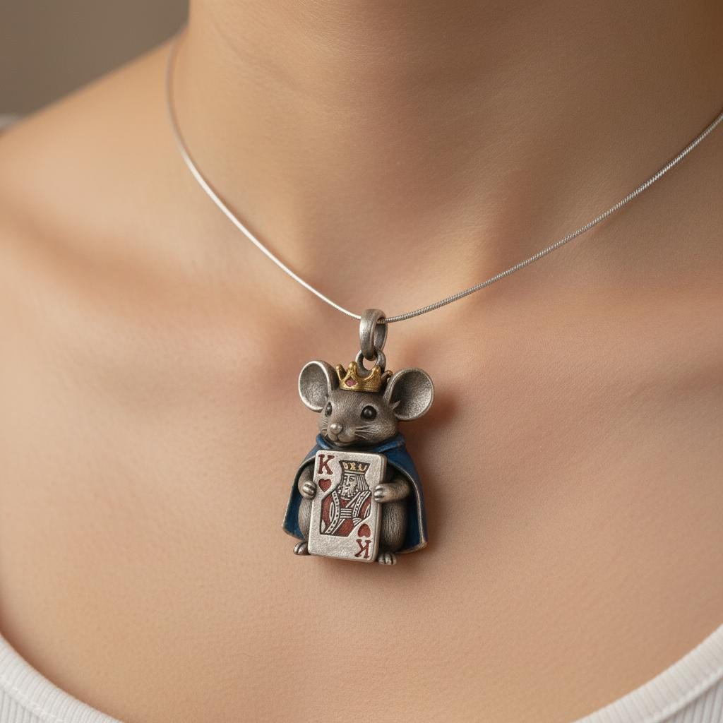 💫 King Mouse Pendant Crafted from S925 sterling silver, this exquisite King Mouse Pendant 👑🐭 Features a regal little mouse holding a detailed King of Hearts card, adorned with glossy enamel in deep red and vivid blue tones. The golden crown and royal cloak further highlight its noble charm. This piece symbolizes wisdom, protection, and playful courage — perfect for fantasy lovers, animal enthusiasts, or anyone who enjoys unique artistic jewelry✨