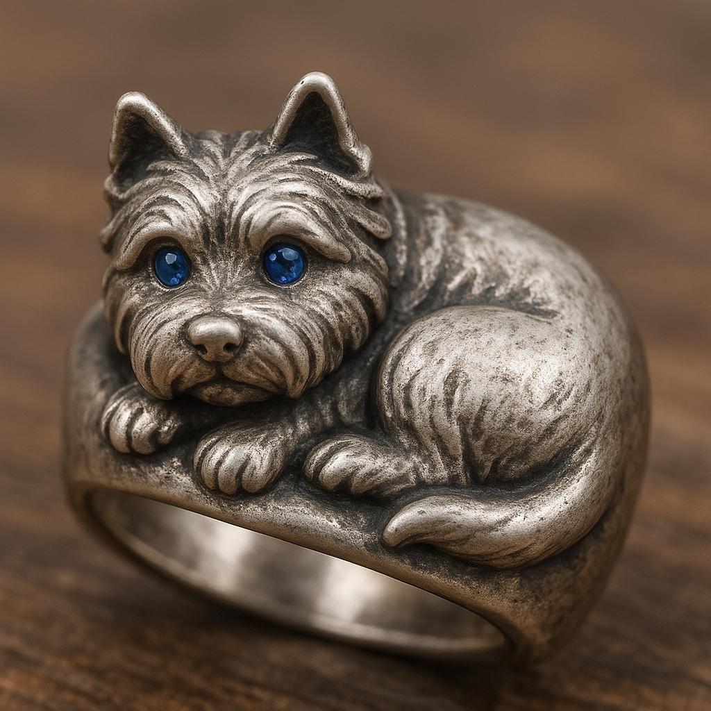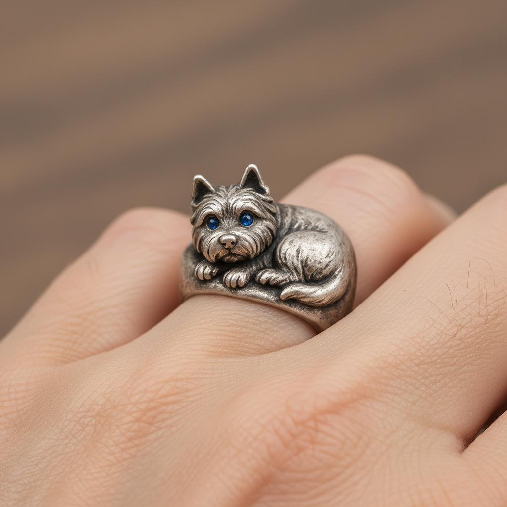 💫 Blue-Eyed Puppy Ring🐶 Crafted from S925 sterling silver, this exquisite Blue-Eyed Puppy Ring 🐾 Features a lovably curled puppy resting atop the band, with sparkling deep blue zircon eyes that shine like tiny stars The textured fur details offer a heartwarming lifelike charm, making the little pup appear as if it's quietly keeping you company This piece symbolizes loyalty and companionship — perfect for dog lovers and those who treasure heartfelt bonds💙