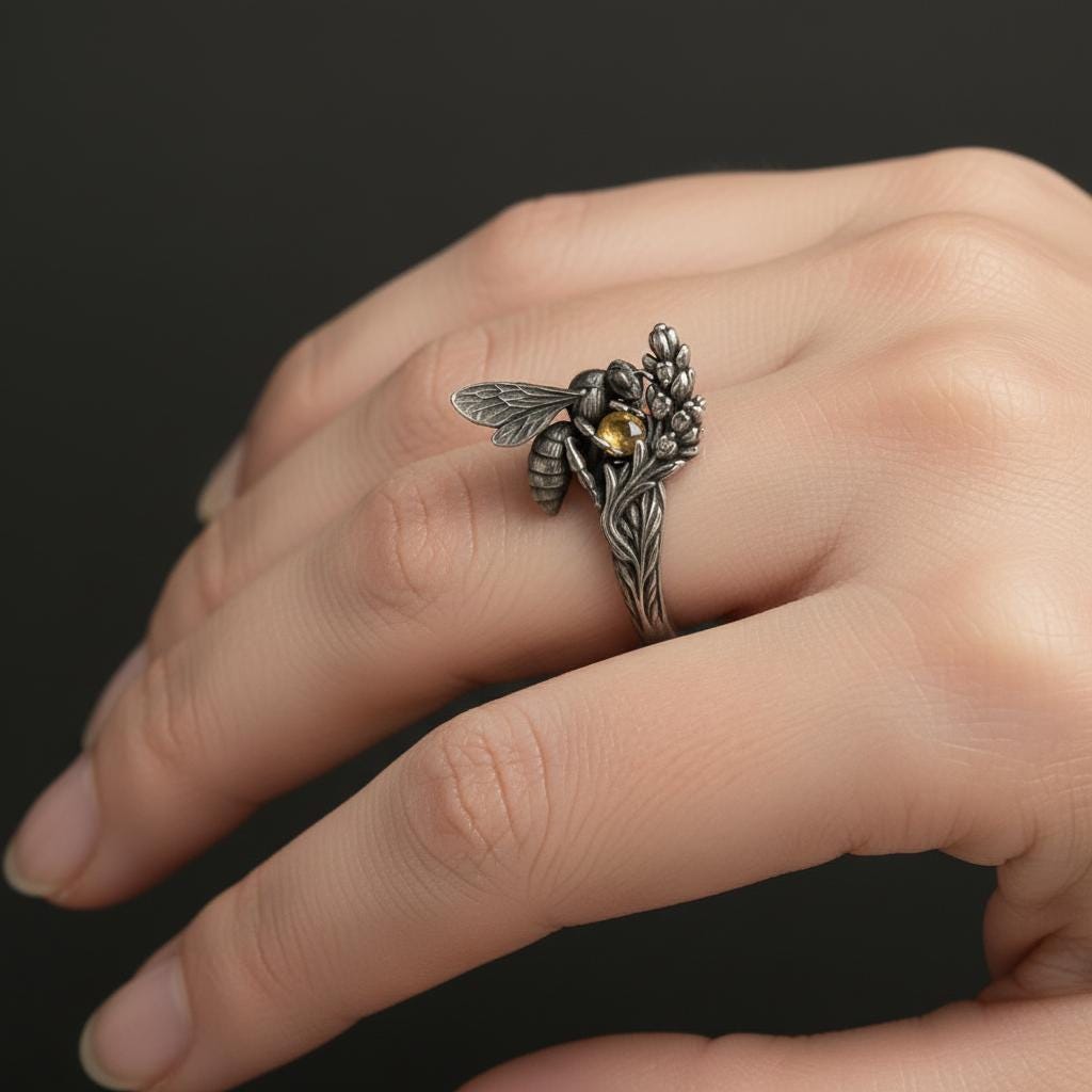 Product details: - Materials: Oxidized sterling silver (925) and faceted citrine gemstone - Design: 3D honeybee, floral and leaf motifs with hand-textured details - Sizing: Available in standard US sizes; custom sizing available on request - Finish: Antique oxidized patina for vintage, dimensional look
