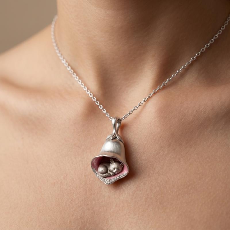 An enchanting sterling silver pendant featuring a sleeping kitten curled inside a delicate bell-shaped flower. Handcrafted with fine sculpted detail, the bell has a soft brushed finish and a subtle pink enamel interior that contrasts the luminous silver. Sparkling crystal accents along the bell rim add gentle sparkle for daytime and evening wear.