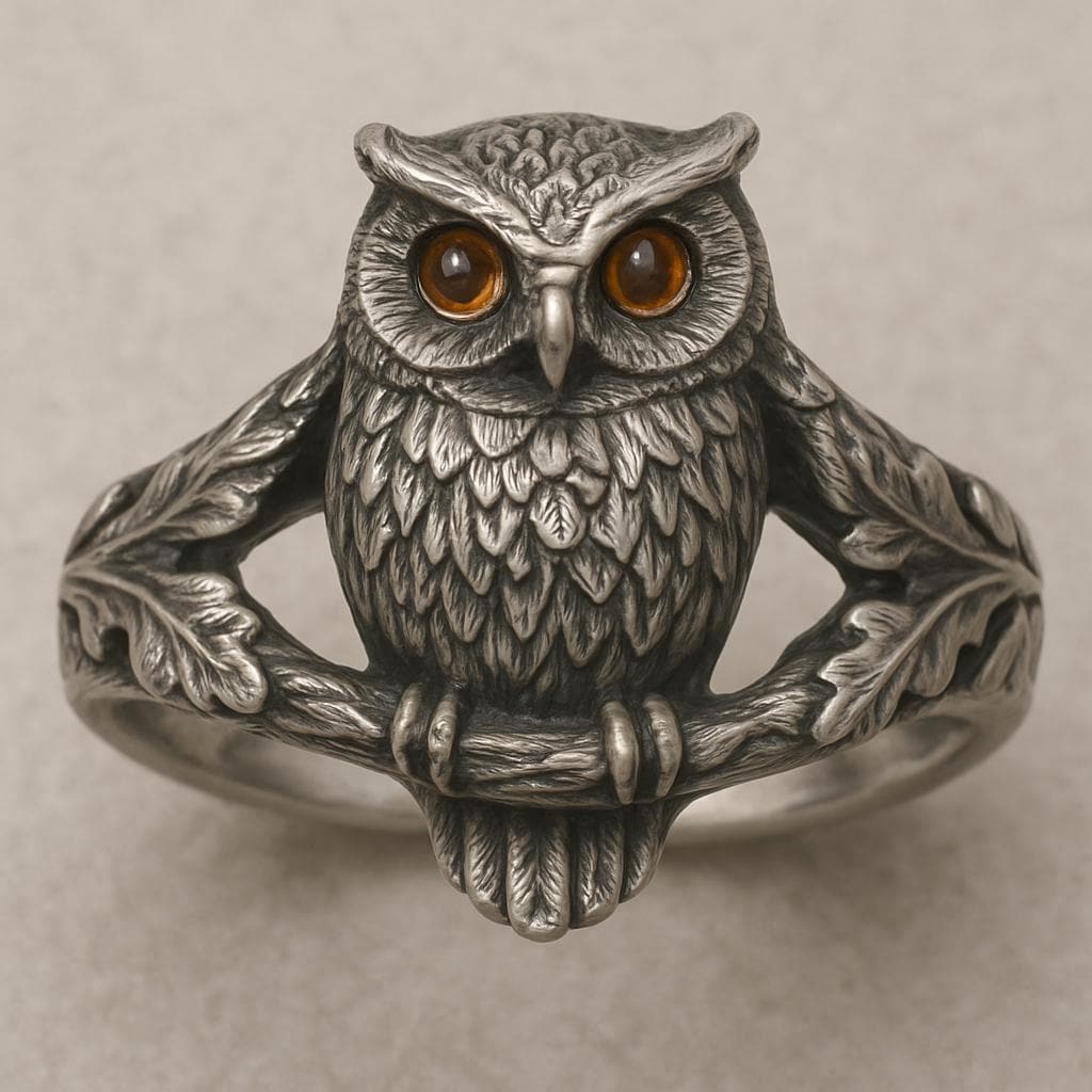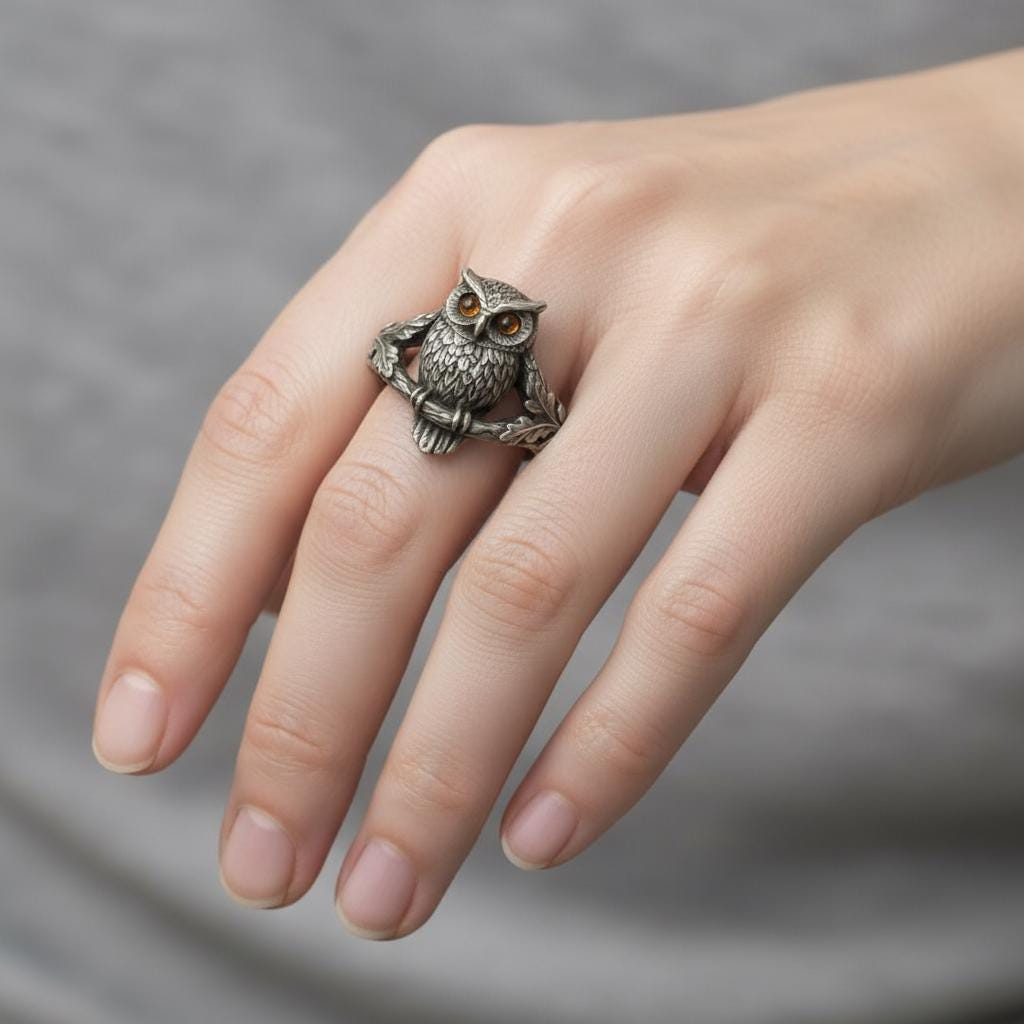 This handcrafted sterling silver owl ring features exquisitely detailed feather carving and warm amber-toned cabochon eyes for a striking, nature-inspired look. Forged in 925 sterling silver with an oxidized finish to accentuate texture and depth, the ring wraps around a branch-style band for organic, woodland charm. Perfect as a boho or vintage statement piece — wear it daily or save it for special occasions, from casual outfits to nature-themed weddings. Available in US sizes 4–12; custom sizing and personalization (engraving) available on request. Ideal gift for her, birthdays, anniversaries, or collectors of animal jewelry. Care instructions: gently polish with a soft cloth, avoid harsh chemicals and prolonged exposure to water, and store in a dry, lined jewelry box. Each piece is handmade, so slight variations make every ring uniquely yours. Returns or cancellations are not accepted, unless damaged.