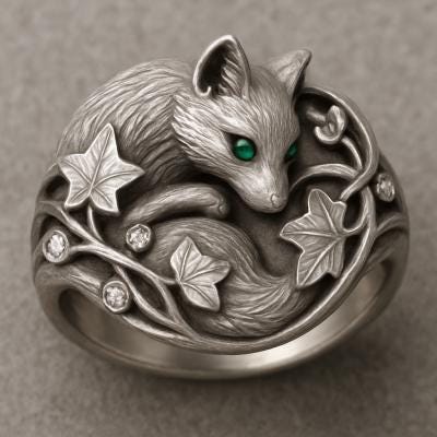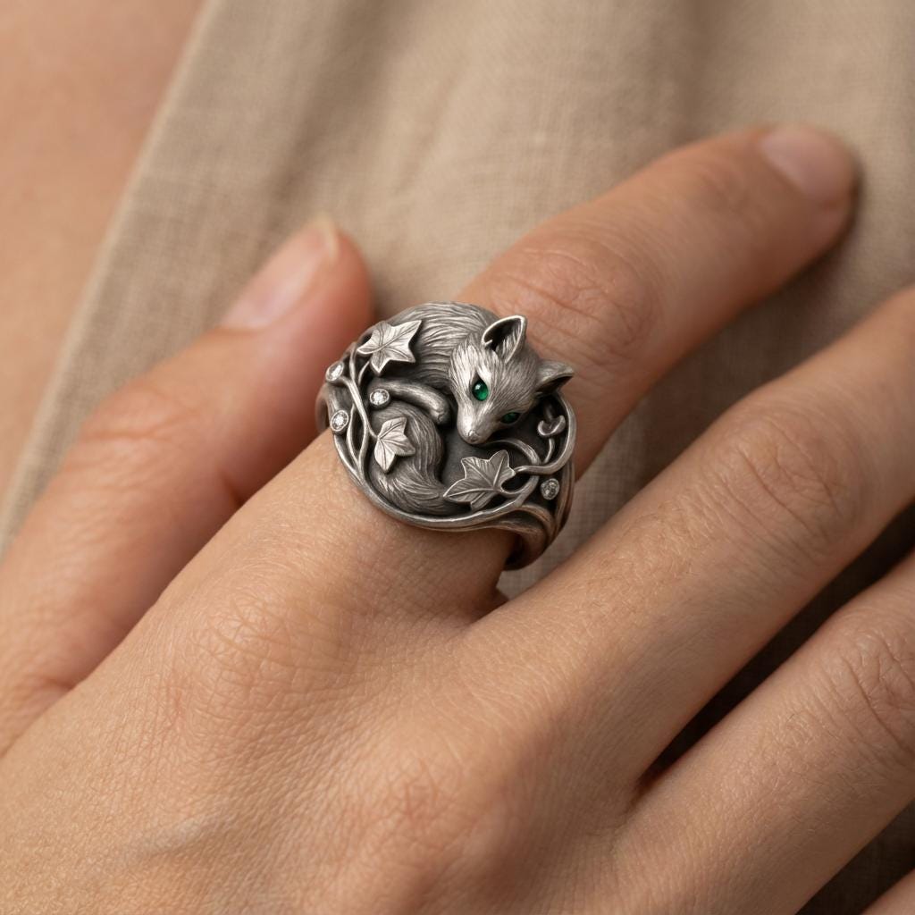 This handcrafted sterling silver fox ring blends whimsical animal design with botanical elegance. Featuring a sculpted fox curled among ivy vines, vivid green gemstone eyes and sparkling clear accent stones, this nature-inspired statement ring is perfect for woodland, boho, or vintage-style jewelry lovers. The oxidized finish highlights intricate details and gives the piece a timeless, artisanal look.