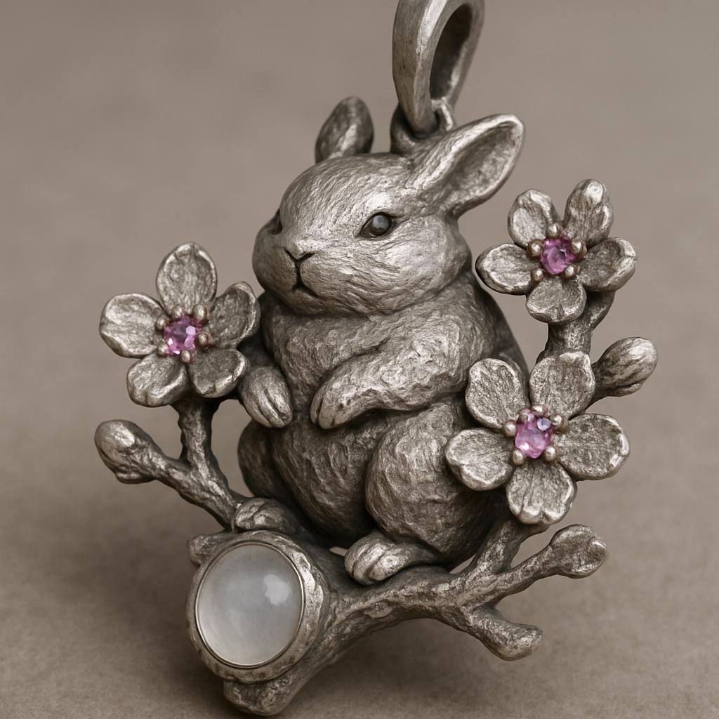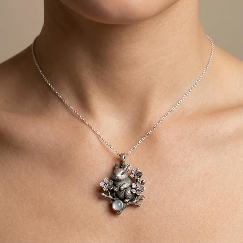 This handcrafted sterling silver bunny pendant necklace captures whimsical charm and fine detail. A hand-textured rabbit sits on a flowering branch, accented with delicate pink gemstone blooms and a bezel-set moonstone cabochon for a soft, luminous focal point. Each pendant is crafted by an independent jewelry artist with attention to texture, depth, and antique-style patina to highlight sculpted details.
