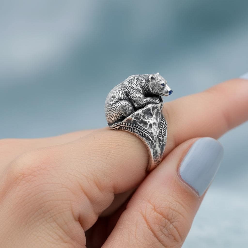 This handcrafted sterling silver bear ring features a finely detailed bear sculpture resting on an organic textured band, accented with blue sapphire stones set in the eyes and nose for a striking focal point. Crafted from solid 925 sterling silver with an oxidized finish, the hand-engraved fur and botanical motifs on the shank create depth and rustic charm. Designed for comfort with a beveled inner band, available in US sizes 5–13 (custom sizes upon request). Perfect as a nature-inspired statement ring for men or women, an anniversary or birthday gift for outdoor lovers, or unique artisan jewelry for collectors. Nickel-free and hypoallergenic; finished and sealed to minimize tarnish. Care: polish gently with a soft cloth and avoid harsh chemicals. Each ring is handmade to order so slight variations make your piece uniquely yours; arrives in a gift box with tracking for worldwide shipping. Returns or cancellations are not accepted, unless damaged.