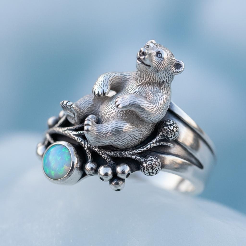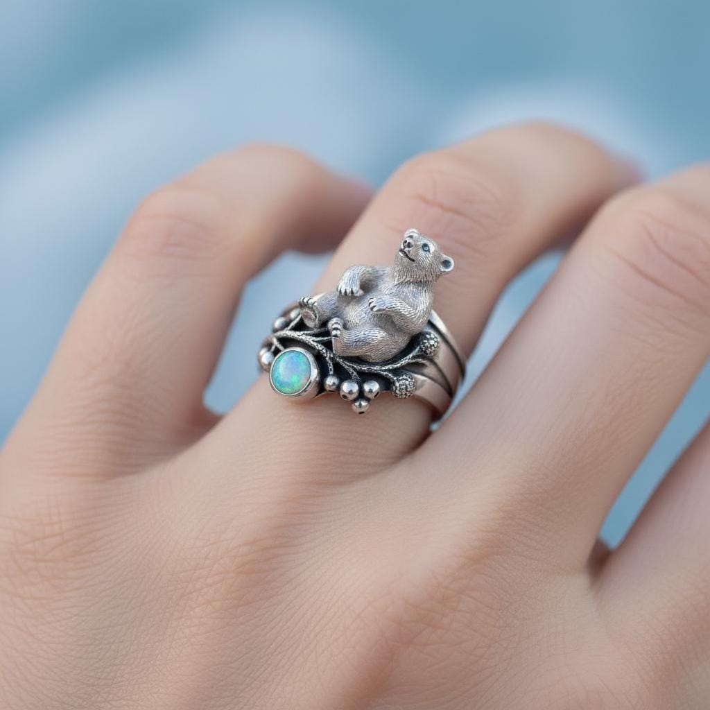 This handmade sterling silver ring features a charming sculpted bear resting beside a luminous blue-green opal cabochon. Expertly crafted in 925 sterling silver with an oxidized finish to accentuate textured fur and organic details, the nature-inspired design blends whimsical animal charm with sophisticated artisan style. The opal displays subtle play-of-color that complements the detailed silverwork, making this ring a standout piece for everyday wear or special occasions. Ideal as a unique gift for animal lovers, woodland-themed weddings, or as a conversation-starting statement ring, it works beautifully alone or stacked with other bands. Each ring is handmade to order, inspected for quality, and available in standard US sizes with custom sizing on request. Care: avoid harsh chemicals, remove for heavy work, and polish gently with a soft cloth to maintain the finish. Keywords: sterling silver, opal ring, bear ring, nature jewelry, handmade artisan ring. Returns or cancellations are not accepted, unless damaged.