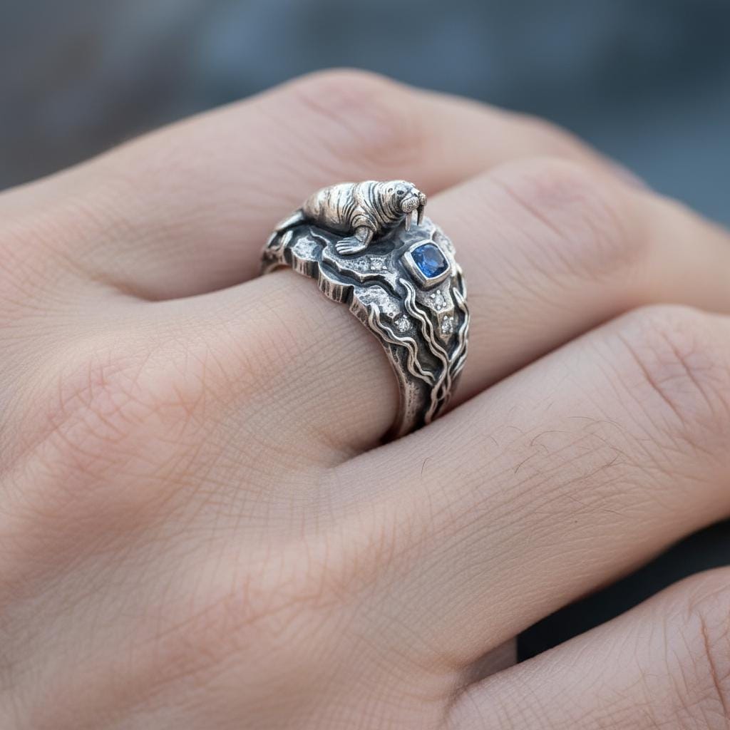 A striking handcrafted sterling silver walrus ring designed for lovers of the sea and sculptural jewelry. This artisan piece features a finely detailed walrus figure resting on a textured ocean wave band, enhanced by a faceted blue sapphire center stone and subtle oxidized patina for depth. The substantial yet comfortable band is hand-carved and finished to highlight flowing wave lines, barnacle-like accents and naturalistic texture.