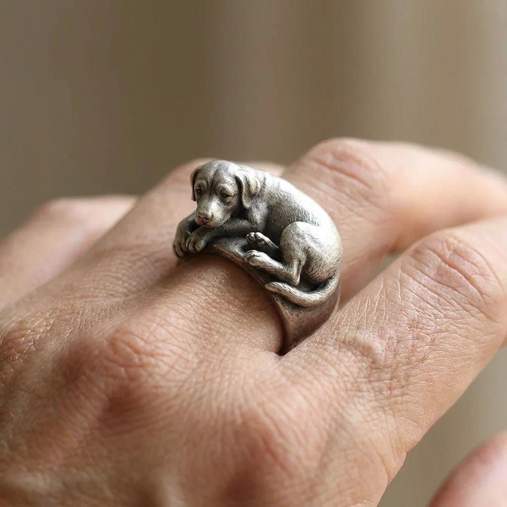 Handcrafted sleeping Labrador ring featuring a curled Labrador dog motif wrapped gently around the band, finished in an antique silver-tone patina for a vintage, textured look. This Labrador wrap ring blends whimsical animal jewelry design with everyday wearable comfort, making it perfect for dog lovers, pet memorial pieces, promise rings, or a unique stackable accent.
