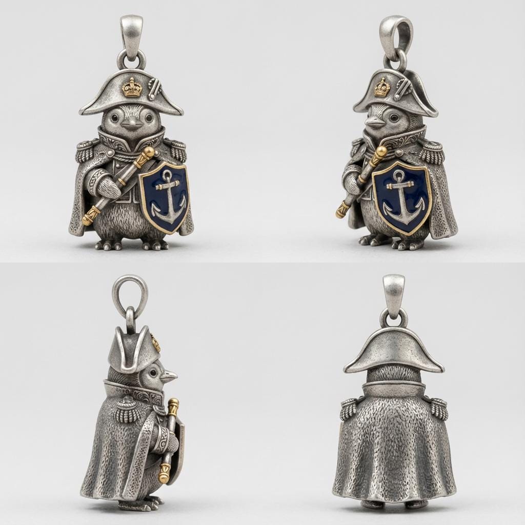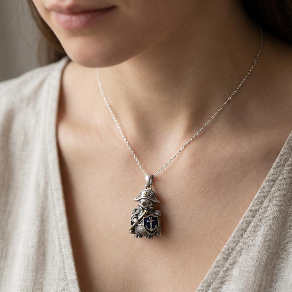 Details Material:Silver Finish: antique + polished sterling-silver look Accents: navy-blue enamel look shield with gold-tone rim + anchor emblem Design: penguin naval commander in uniform, bicorne hat, baton, integrated bail loop Style: nautical, maritime, fantasy, military, gothic/steampunk-adjacent Great for: gifts, sailors/sea lovers, collectors, RPG/fantasy fans Notes Slight color variation may occur due to lighting/screens.