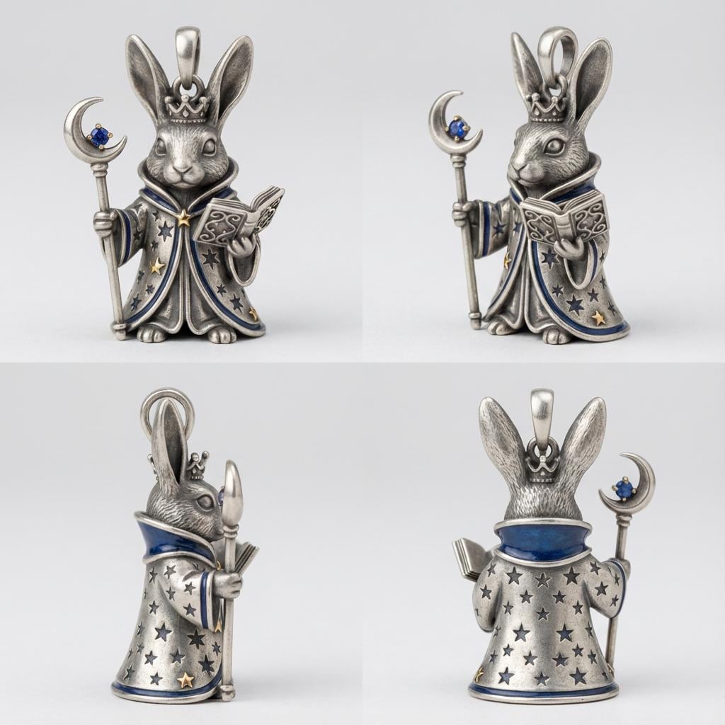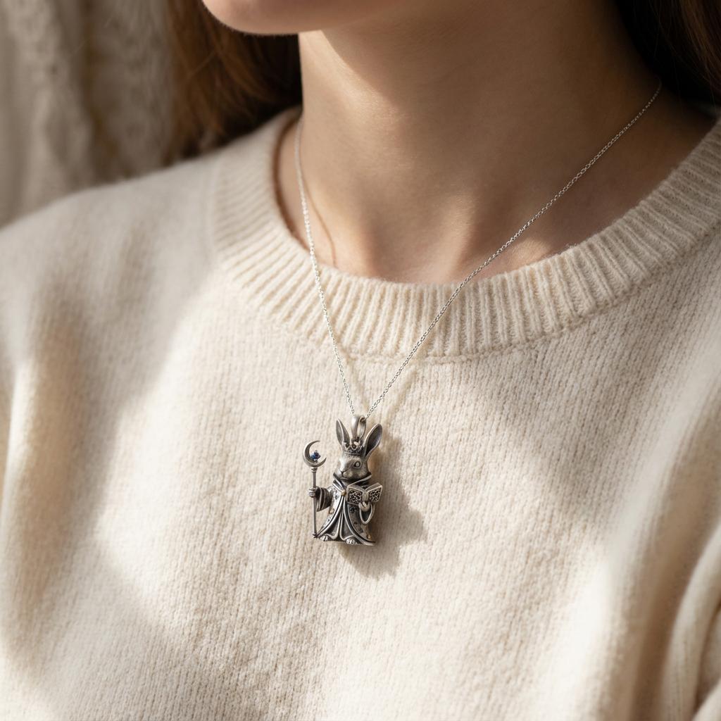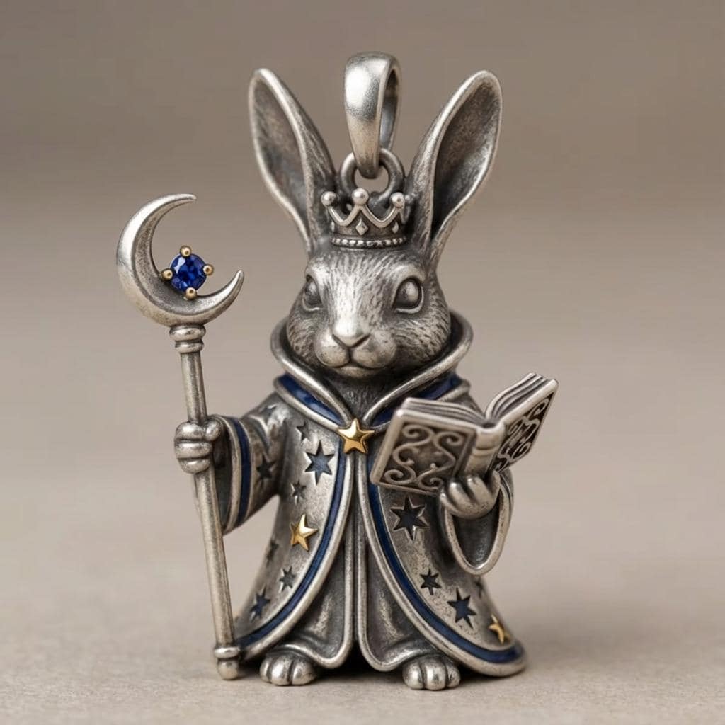 Details Material:Silver Finish: antique + polished sterling-silver look Accents: blue enamel look trim + blue gemstone, small gold star details Design: crowned rabbit wizard with moon staff and book; integrated bail loop Style: fantasy, witchy, cottagecore, gothic, celestial Great for: gifts, readers, RPG/fantasy fans, bunny lovers, magical jewelry collectors Notes Slight color variation may occur due to lighting/screens.