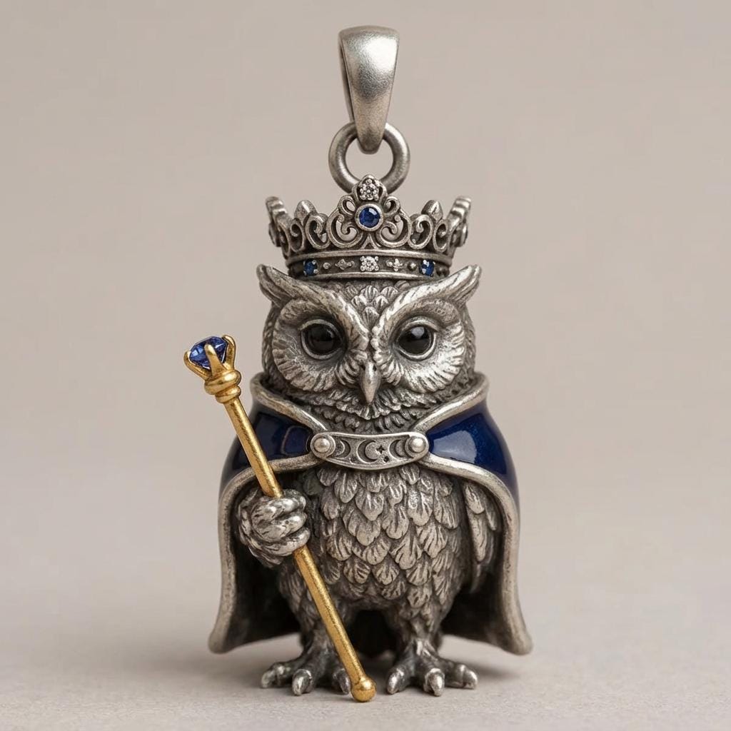 Details Design: crowned owl holding scepter; integrated bail loop for easy chaining Style: fantasy, gothic, medieval royal, woodland creature Perfect for: gift for her/him, owl lovers, D&D/fantasy fans, anniversary/birthday Notes Colors may vary slightly due to lighting/screens.